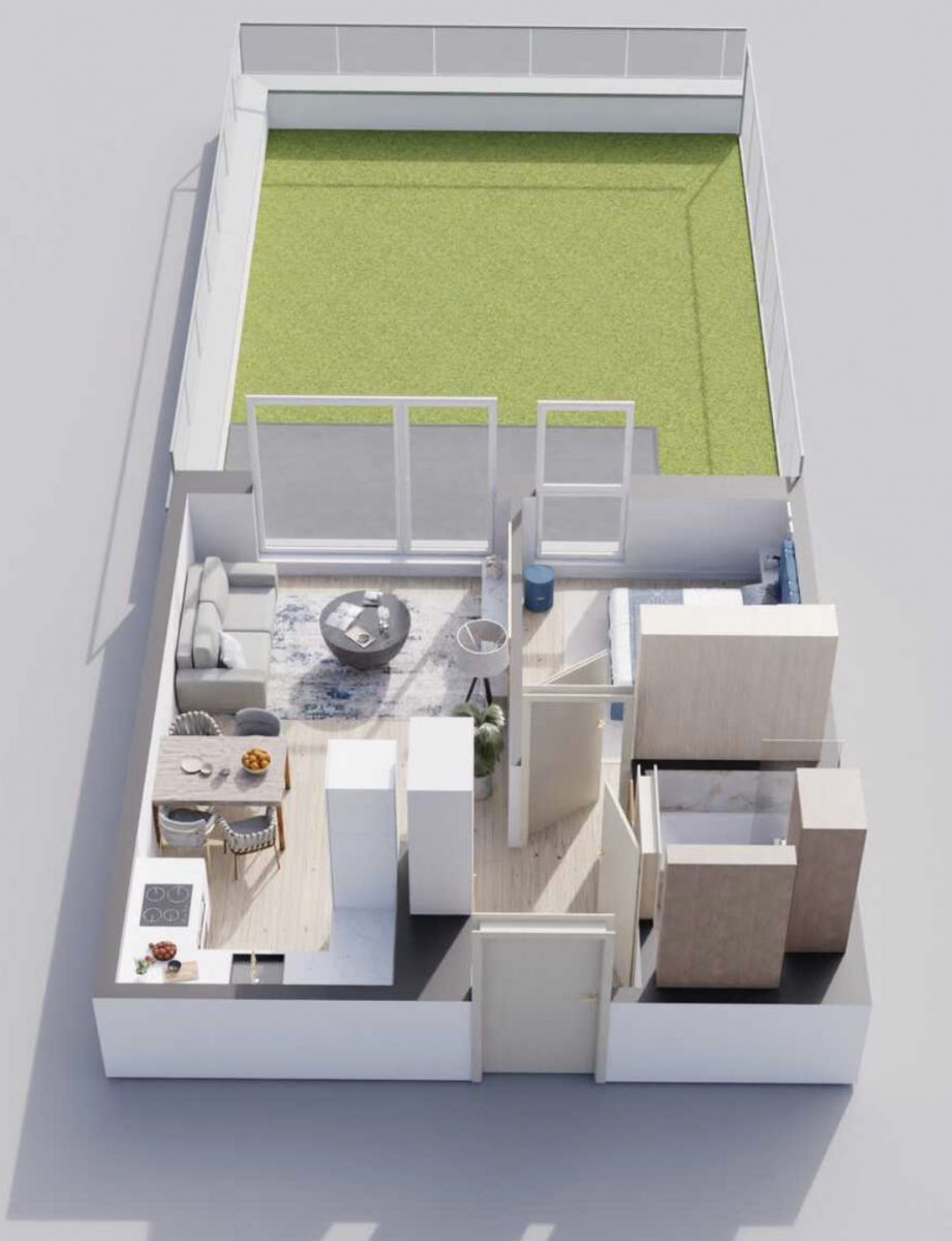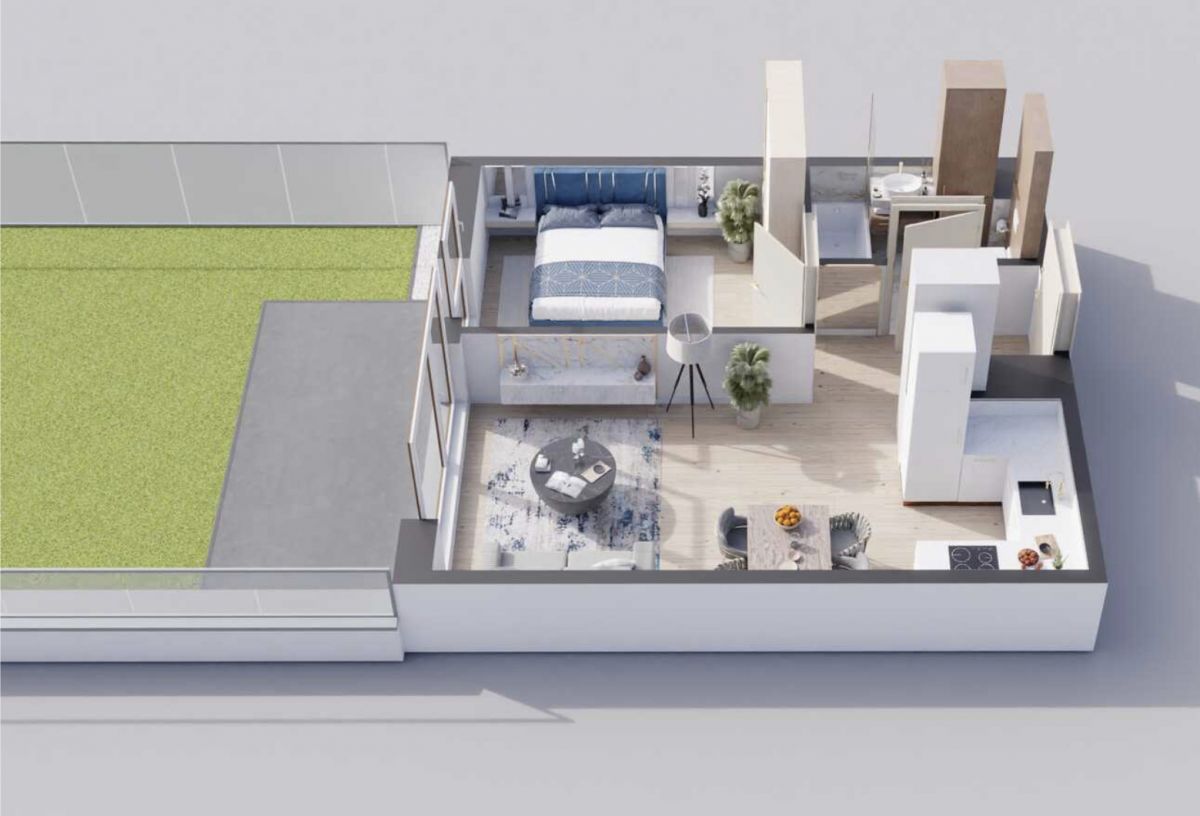 - Przestronny salon z aneksem kuchennym i wyjściem na imponujący taras o powierzchni 56 m²,