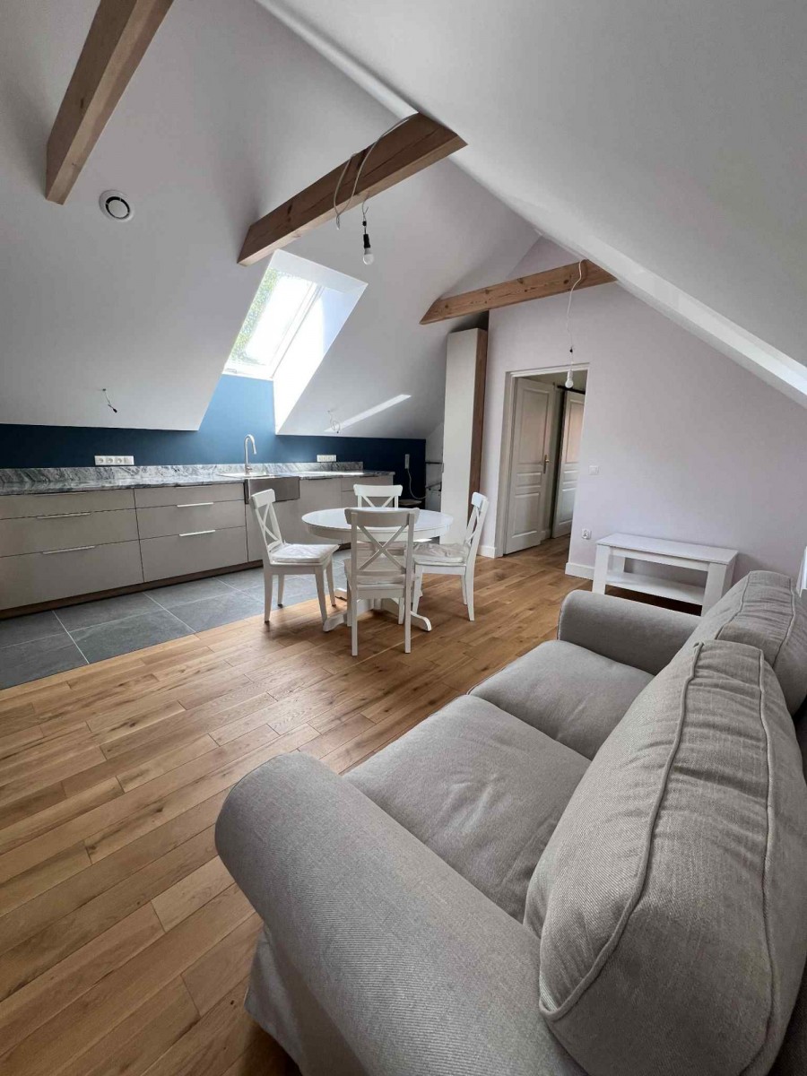 Przedmiotem oferty jest samodzielne mieszkanie usytuowane na poddaszu budynku położonego na ogrodzonej, prywatnej posesji. Lokal po pełnym remoncie — nowy, czysty, wykończony w spójnej estetyce i przygotowany do natychmiastowego zamieszkania.