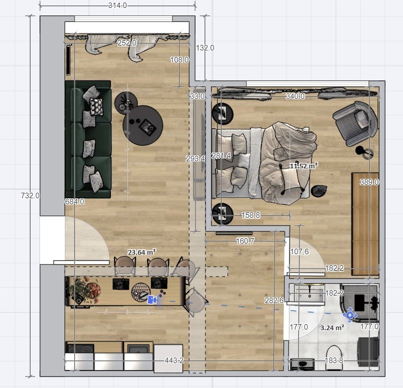 Mieszkanie o powierzchni 41,35 m2. składa się z: