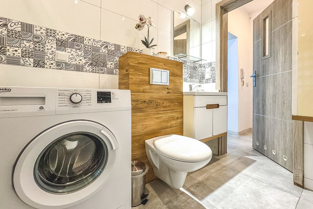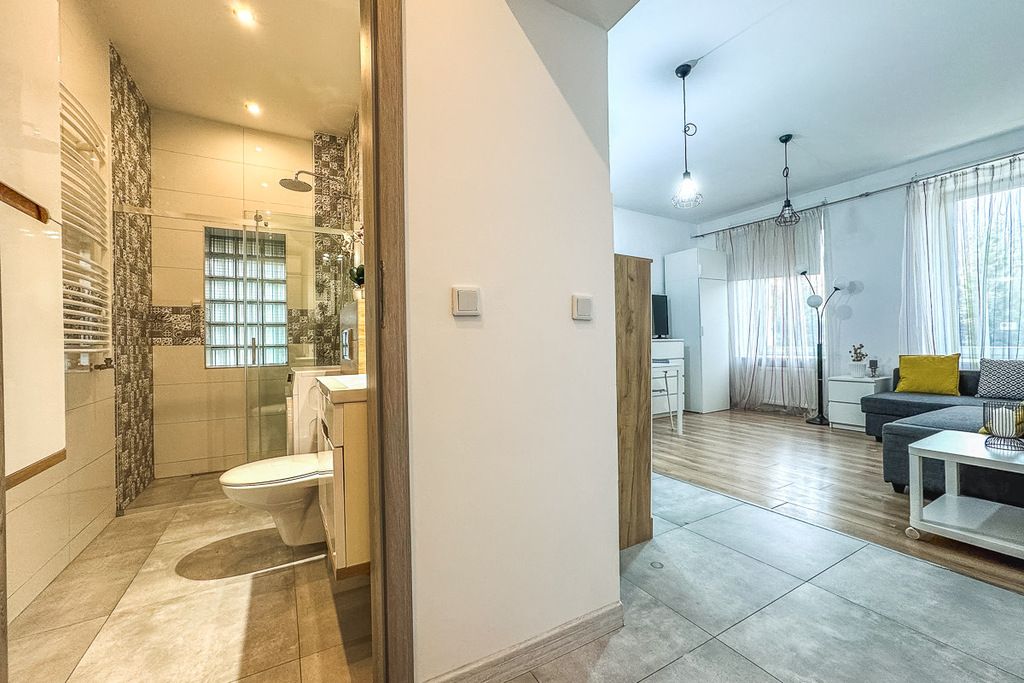 Jasne okna wychodzą na zachód, co zapewnia przyjemne doświetlenie wnętrza. Wysokość pomieszczeń to 270 cm, a podłogi wykończono panelami oraz płytkami. Aneks kuchenny jest w pełni wyposażony w meble w zabudowie, lodówkę, zmywarkę, okap, piekarnik, mikrofalówkę, elektryczną płytę grzewczą oraz zlewozmywak. Łazienka z WC posiada prysznic, pralkę, umywalkę oraz grzejnik drabinkowy. Mieszkanie jest w dobrym stanie, wyposażone w drzwi antywłamaniowe oraz okna PCV.