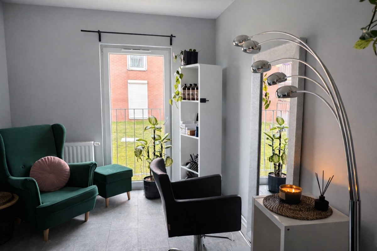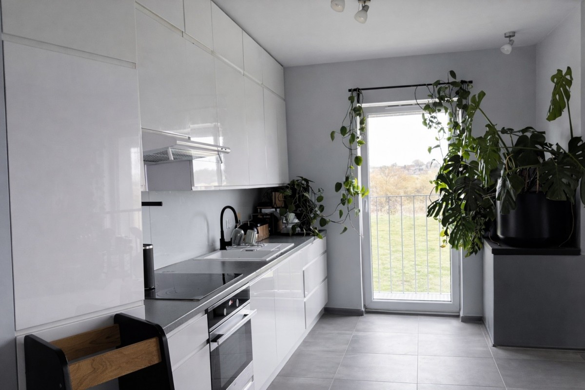 • na podłogach: płytki (salon, kuchnia), panele (pokoje)