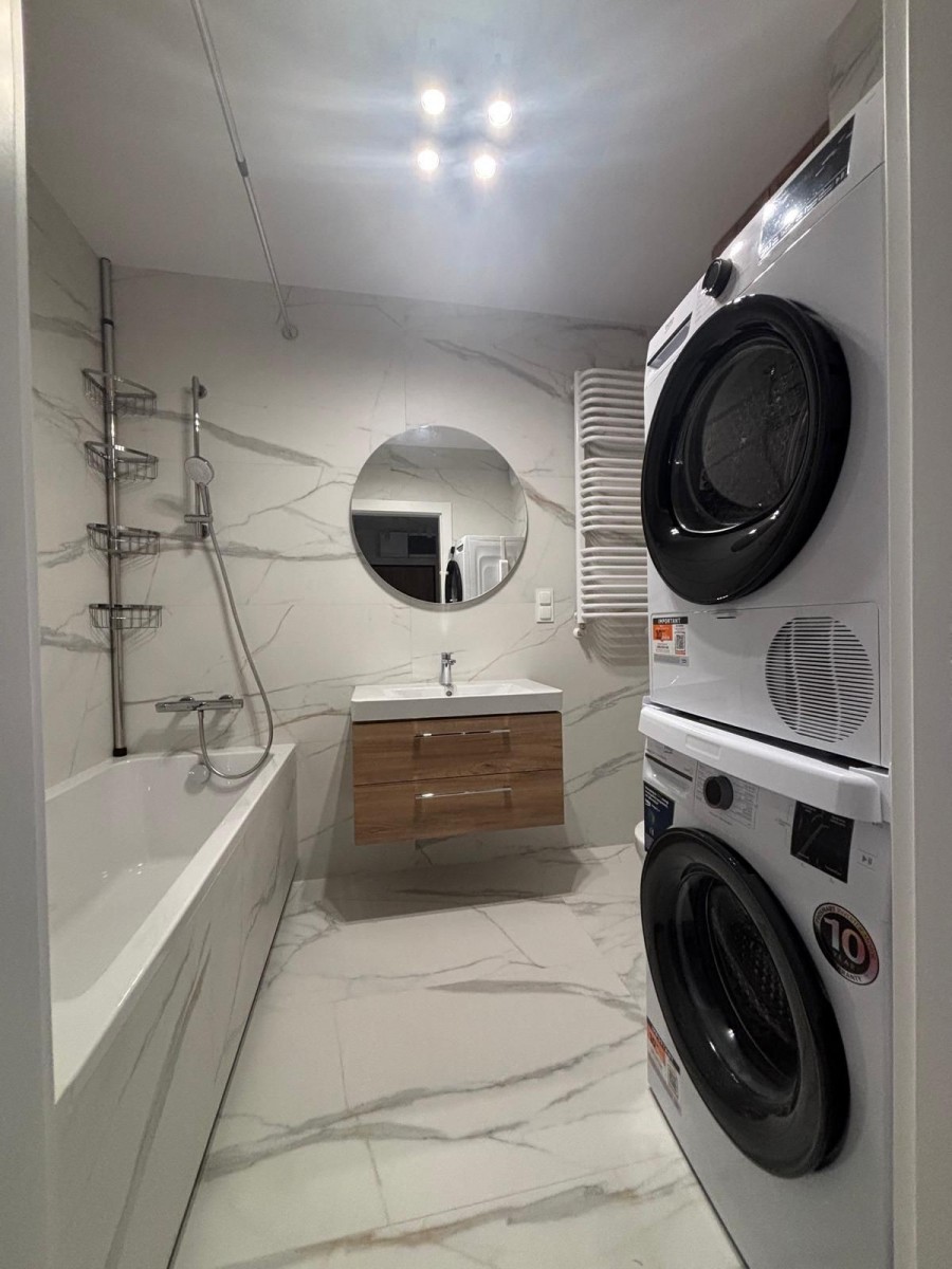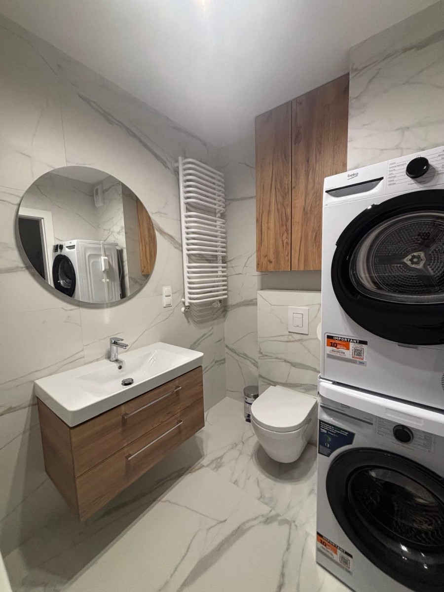 Dzięki takiemu układowi mieszkanie jest bardzo komfortowe i dobrze sprawdzi się zarówno dla pary, rodziny, jak i osób pracujących zdalnie.