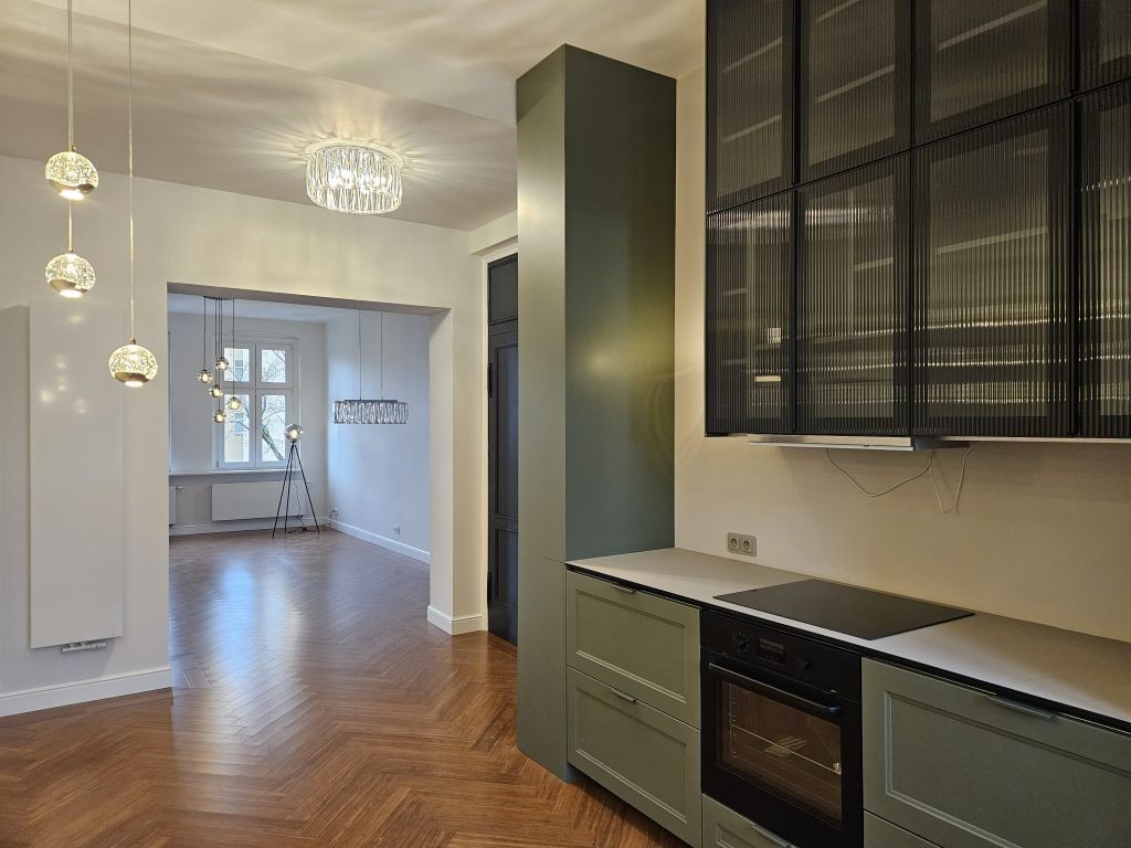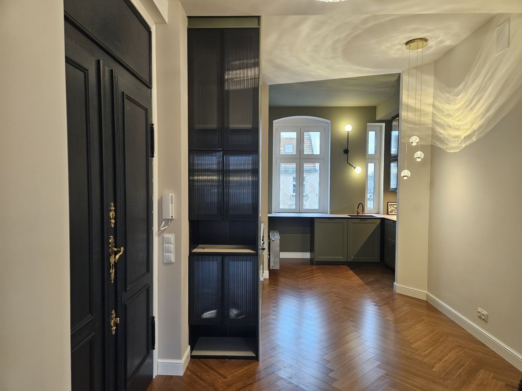 Mieszkanie po generalny remoncie, wykończone w wysokim standardzie z dbałością o detal. Składa się z salonu otwartego na pokój sypialny (z loggią od zachodu), otwartej na korytarz kuchni (zabudowanej i wyposażonej w niezbędne sprzęty AGD), dużej łazienki (z oknem, wanną i szafą wnękową) oraz korytarza (z szafą). Mieszkanie z wieloma otwartymi przestrzeniami. Dla 1 os. lub pary pracującej. Preferowana umowa najmu okazjonalnego. W temacie zwierząt - kot jest dopuszczalny (siatka na balkonie). Parkowanie niestety na ulicy lub dzikim parkingu za kamienicą. Elewacja frontowa po remoncie. Klatka schodowa w trakcie. Pokoje nie są umeblowane. Czynsz najmu 4000 zł + czynsz admin. 587,19 zł (przy 2 osobach) + prąd i ogrzewanie gazowe.