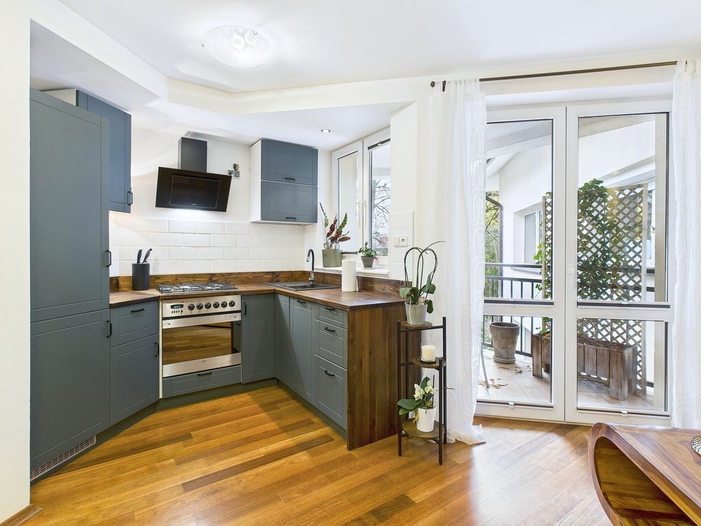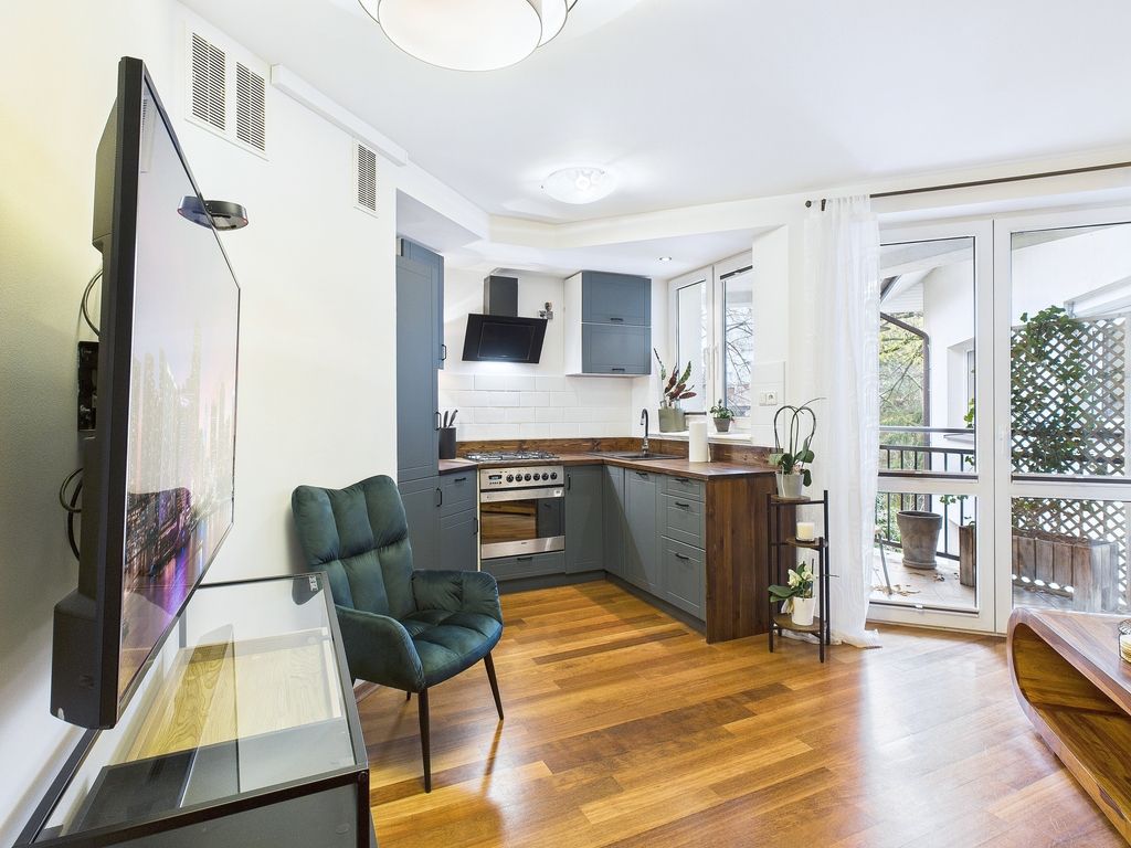of Ursynów near Roentgena Street . The apartment is located in a low-rise building, surrounded by greenery and with convenient access to public transportation. The apartment is quiet, functional, and move-in ready. The balcony offers a view of the peaceful, green surroundings.