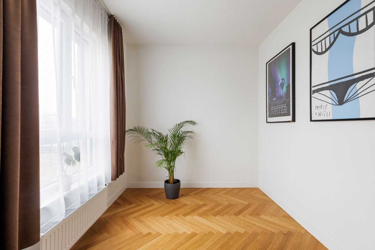 Apartament dwustronny z przejrzystym układem i wydzielonymi strefami. Na jednym krańcu znajdują się przytulne sypialnie, a po drugiej stronie pokój dzienny z kuchnią. Przestronności dodają duże okna.
