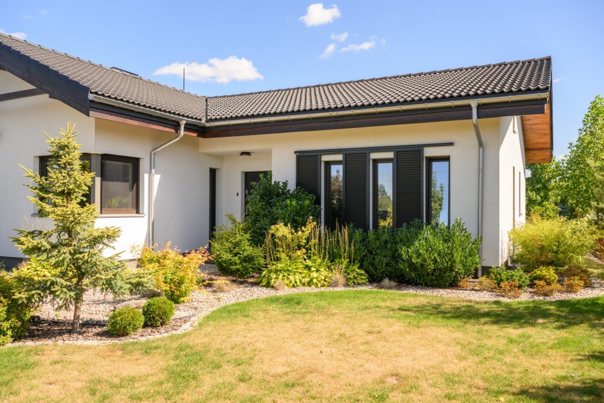 - Dach wielospadowy, pokryty dachówką BRASS (czarny mat).
