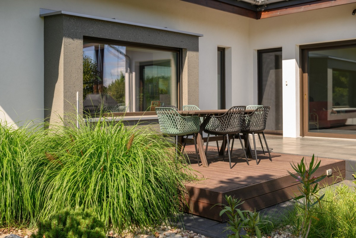 - Tarasy: betonowe z powierzchnią bazaltową oraz dwa z modrzewia syberyjskiego.