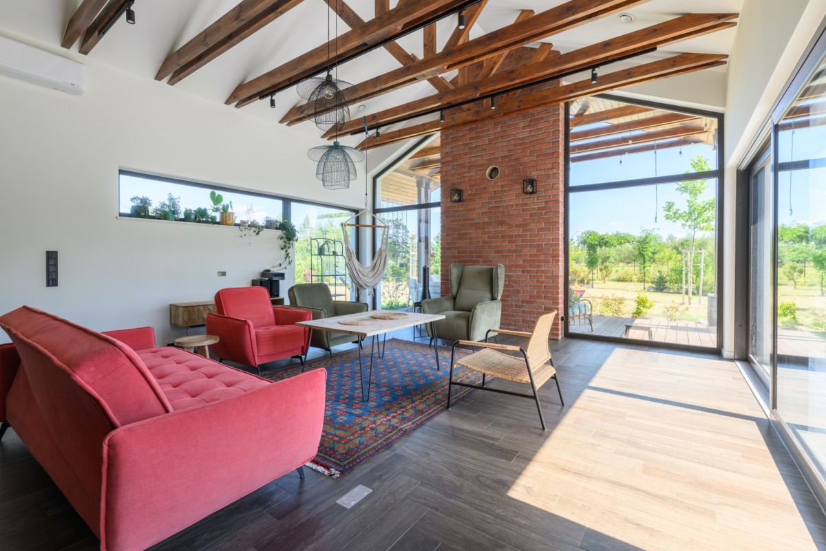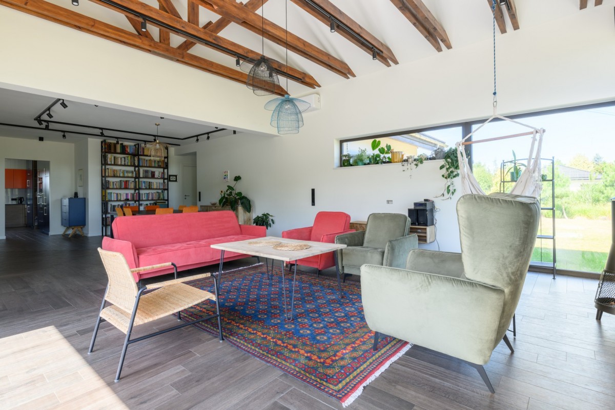 - Salon z jadalnią - ponad 65 m², imponująca wysokość, widoczne elementy konstrukcyjne dachu (jętki z drewna w kolorze ciemny orzech).