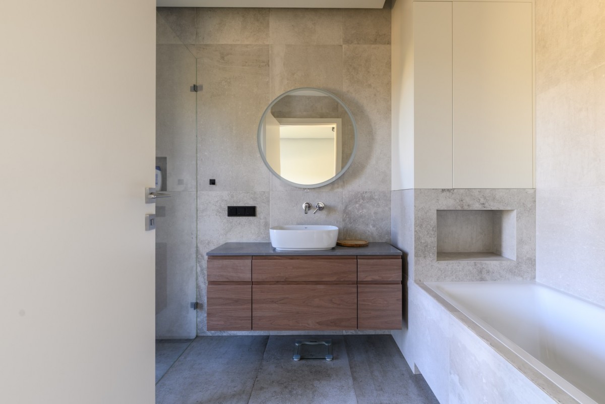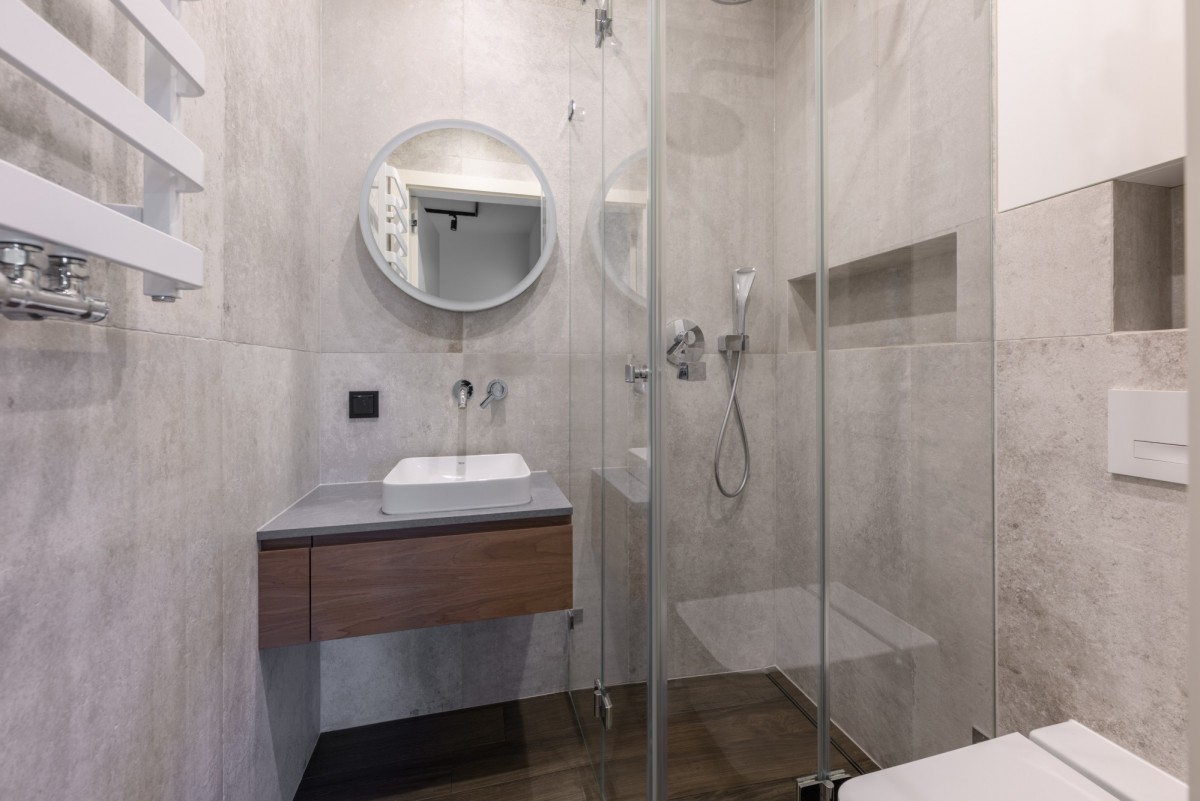 - gres imitujący beton architektoniczny w łazienkach.