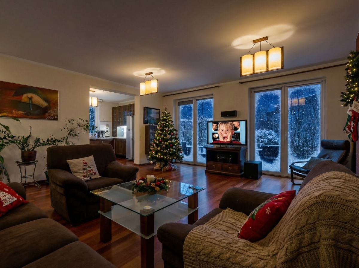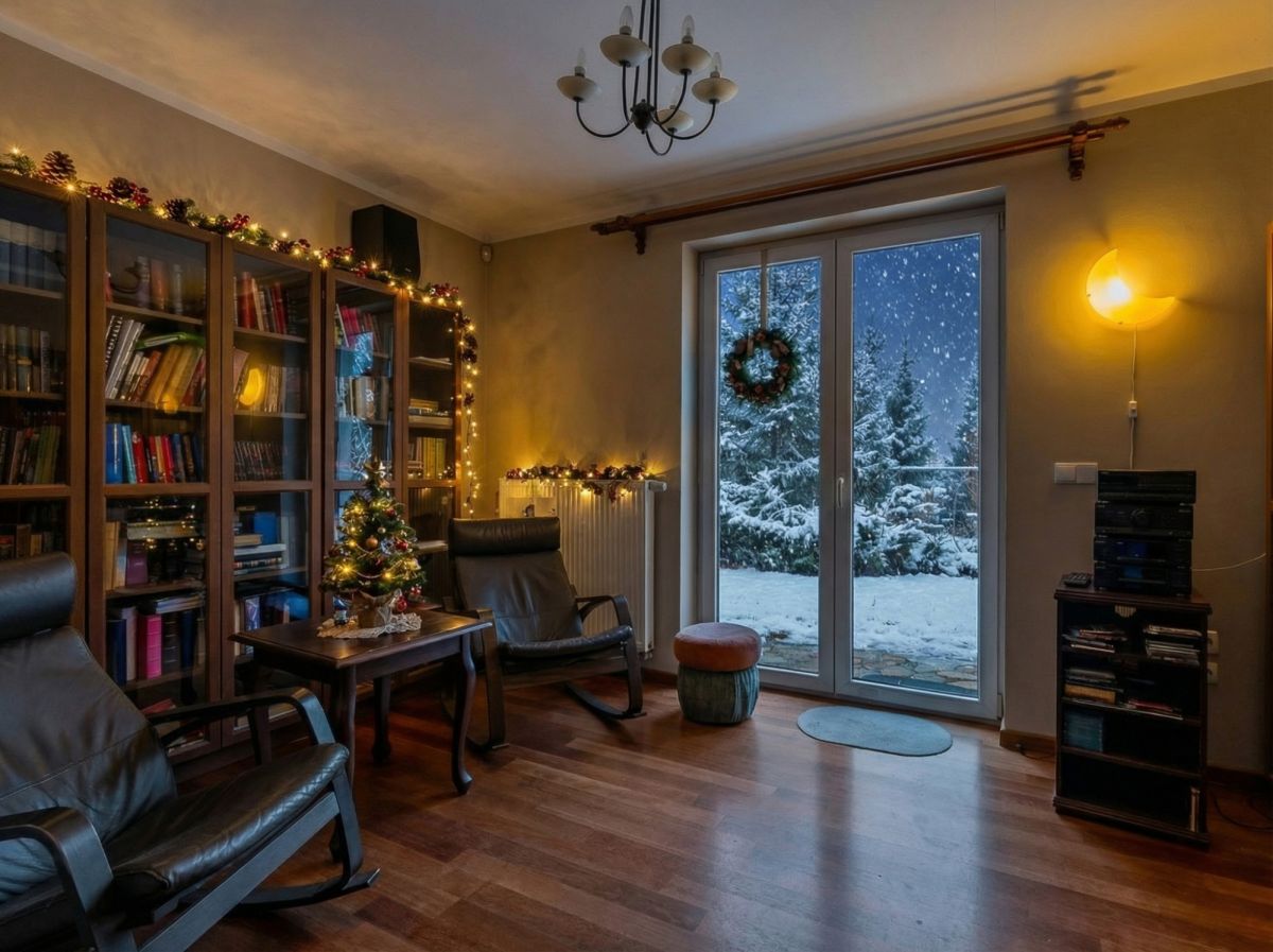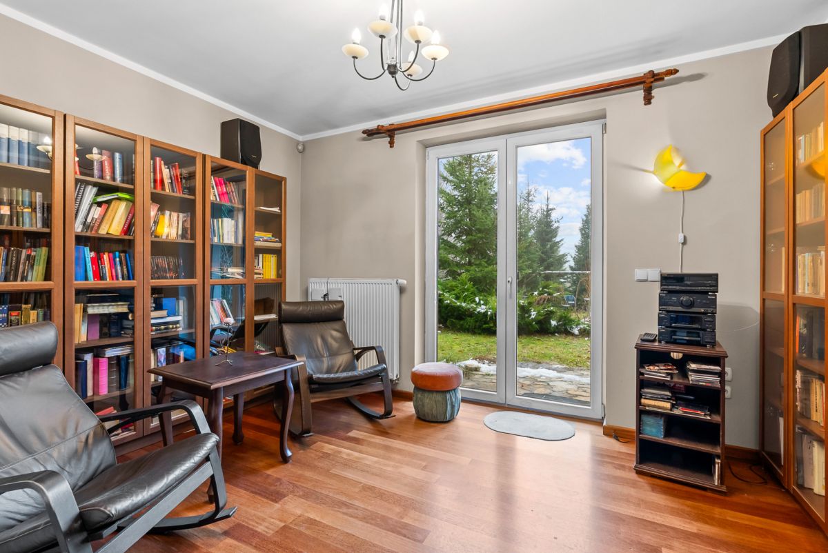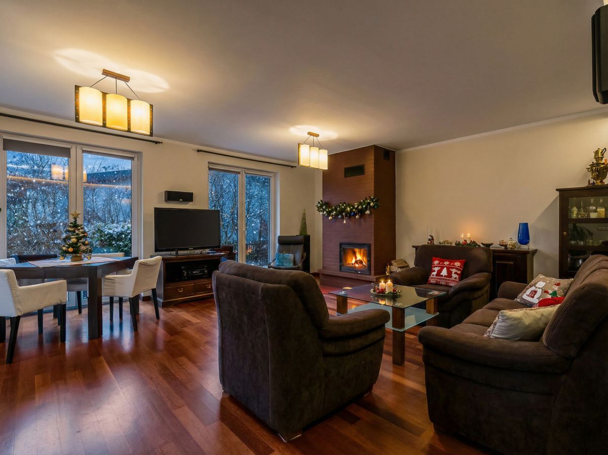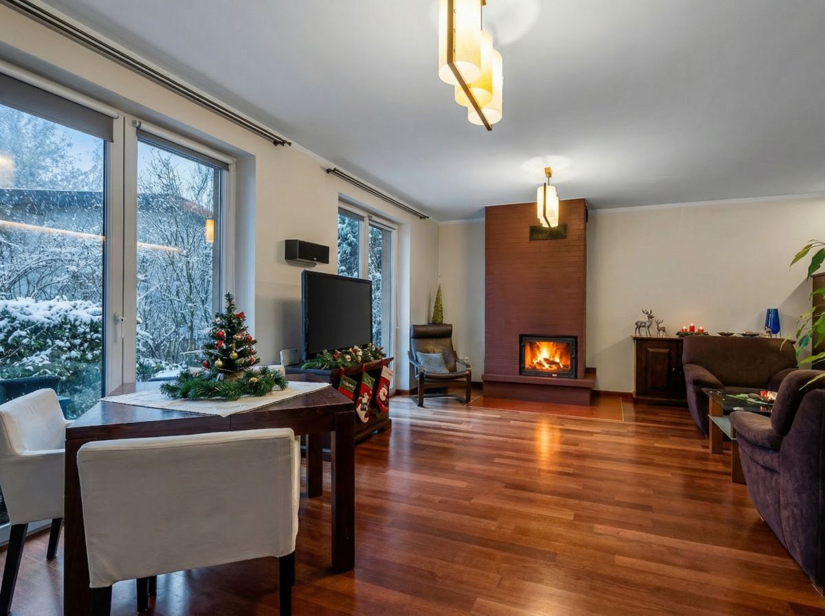 - Kominek w salonie, zapewniający klimat w długie zimowe wieczory;