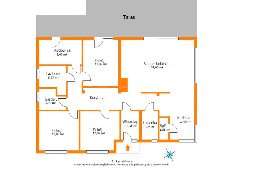 Rozkład pomieszczeń: - Przestronny salon z jadalnią i bezpośrednim wyjściem na ogród.