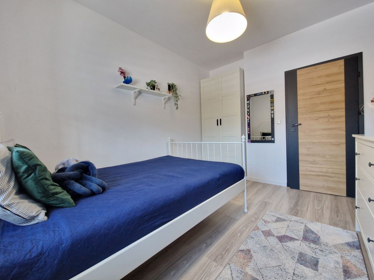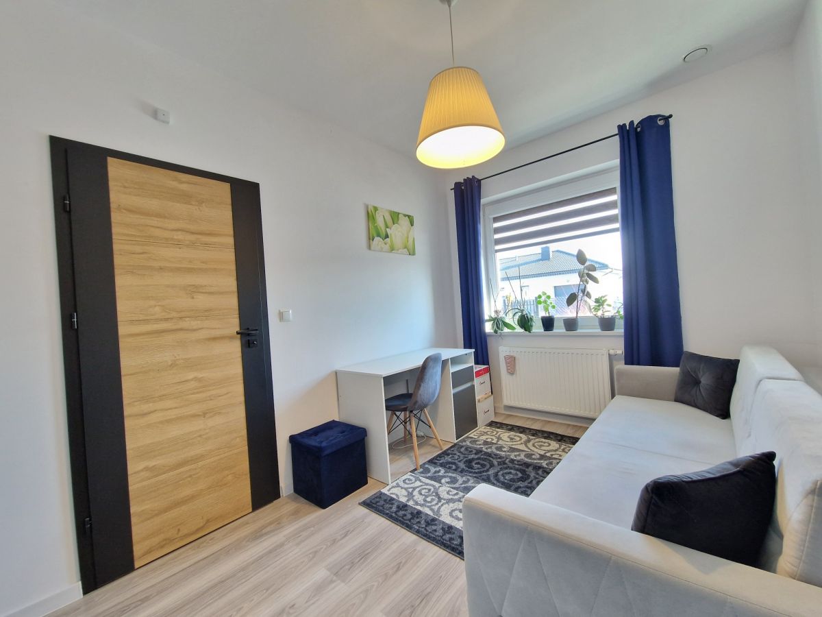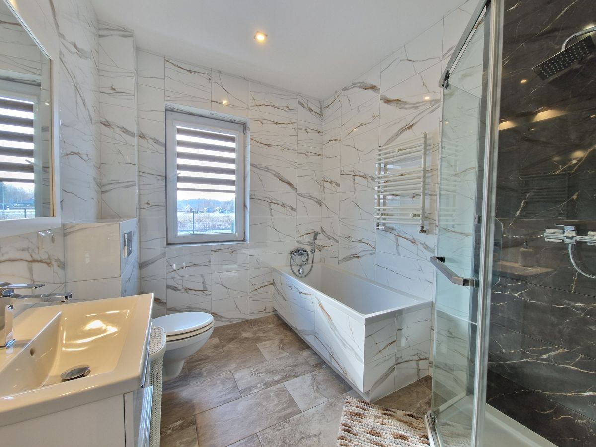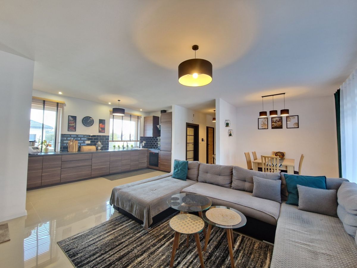Przestronna, około 40m2 strefa dzienna - salon z aneksem kuchennym i wydzieloną częścią jadalną z wyjściem na taras (ok. 25m2), dodatkowo przy kuchni znajduje się podręczna spiżarnia, 3 sypialnie, łazienka z wanną i z kabiną prysznicową oraz oddzielne wc. Dodatkowa powierzchnia jaką jest poddasze stanowi doskonale miejsce do przechowywania. W bryle budynku garaż dla jednego samochodu, a przed domem wydzielona część do zaparkowania trzech kolejnych pojazdów.
