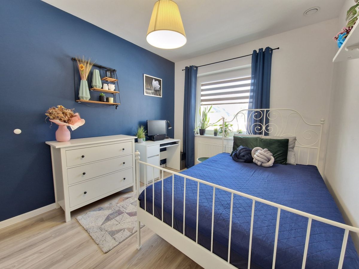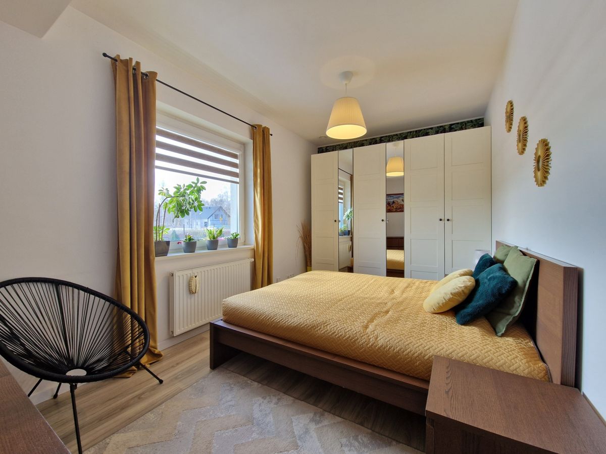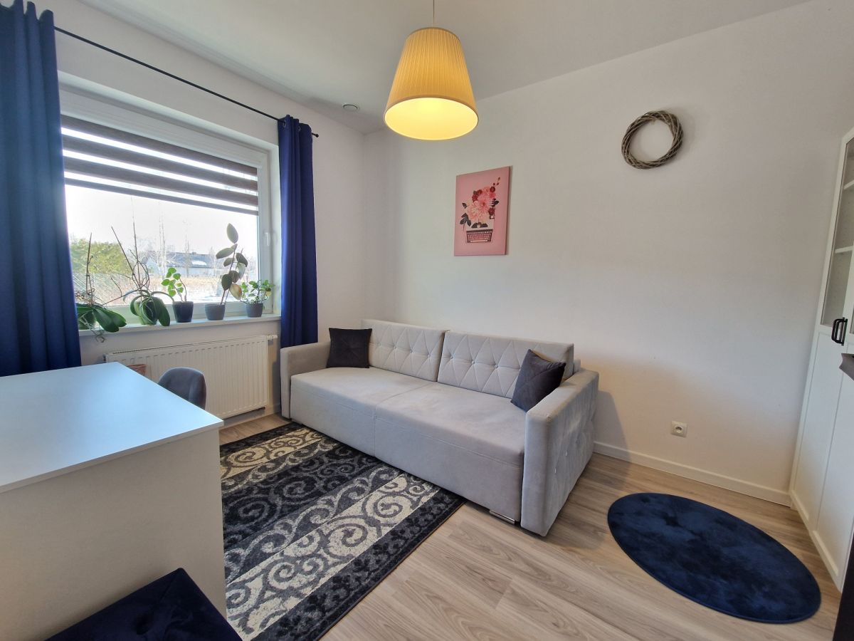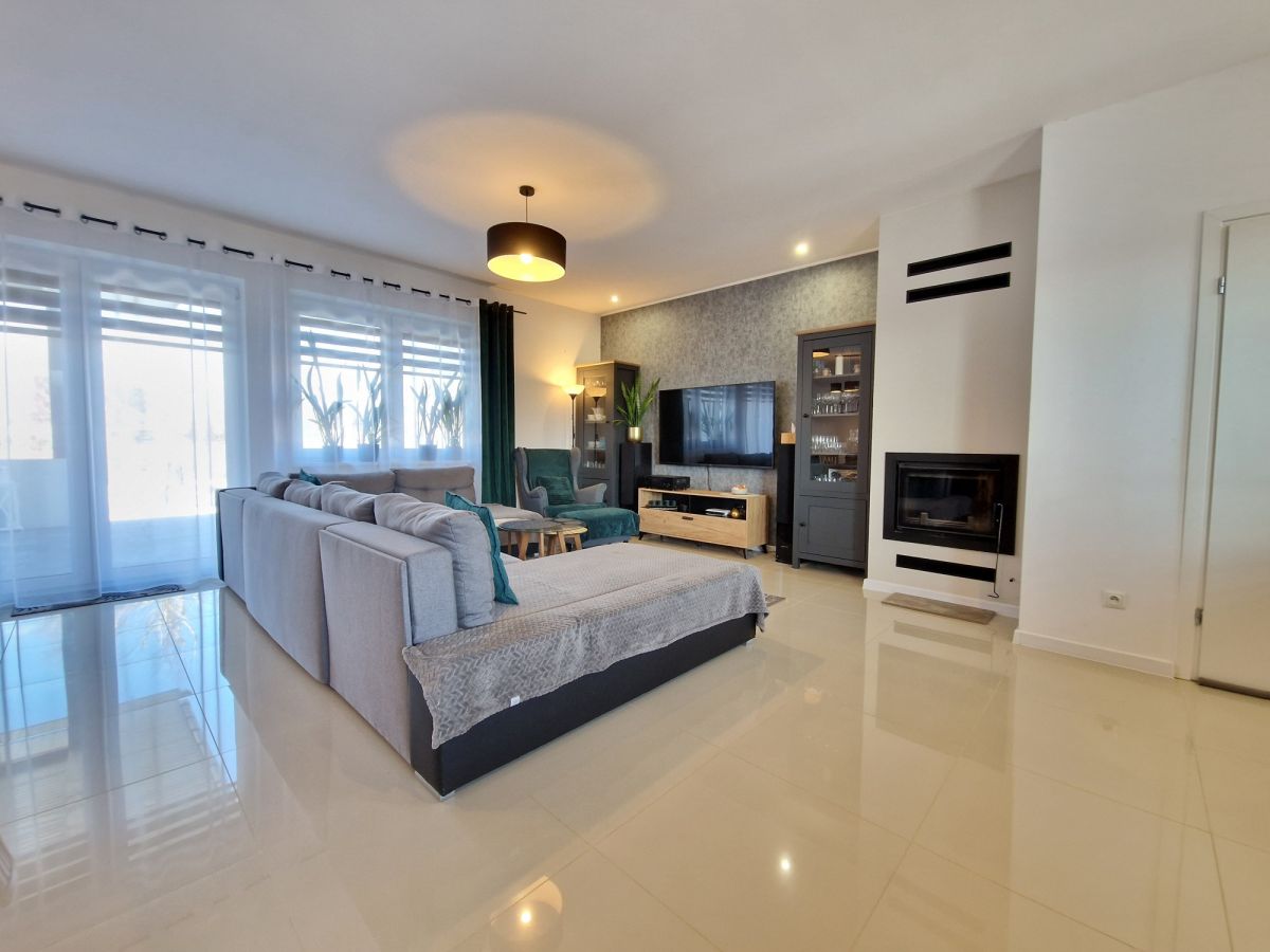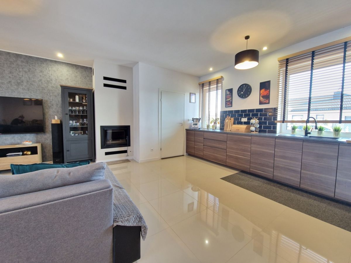 Przestronna, około 40m2 strefa dzienna - salon z aneksem kuchennym i wydzieloną częścią jadalną z wyjściem na taras (ok. 25m2), dodatkowo przy kuchni znajduje się podręczna spiżarnia, 3 sypialnie, łazienka z wanną i z kabiną prysznicową oraz oddzielne wc. Dodatkowa powierzchnia jaką jest poddasze stanowi doskonale miejsce do przechowywania. W bryle budynku garaż dla jednego samochodu, a przed domem wydzielona część do zaparkowania trzech kolejnych pojazdów.