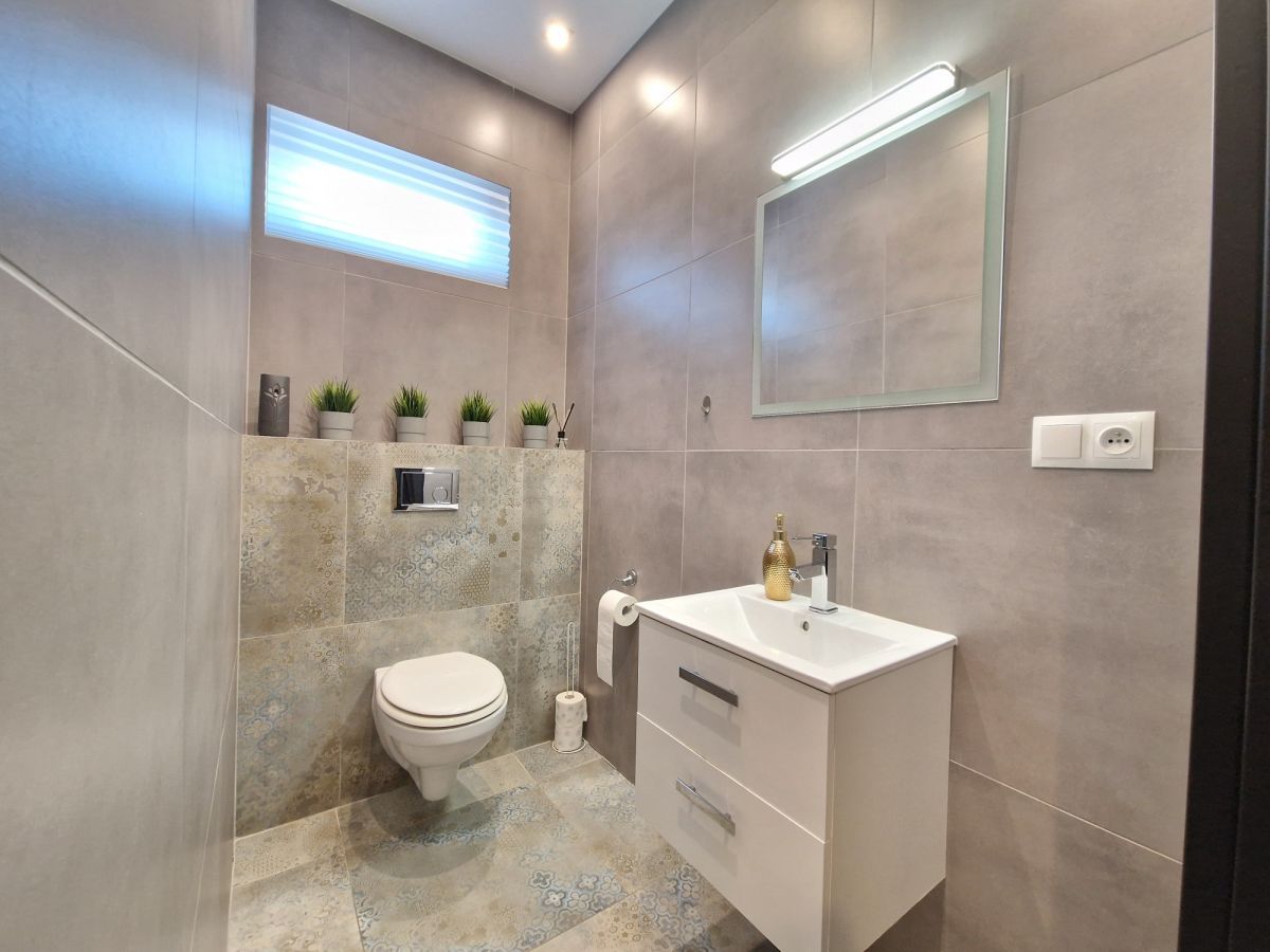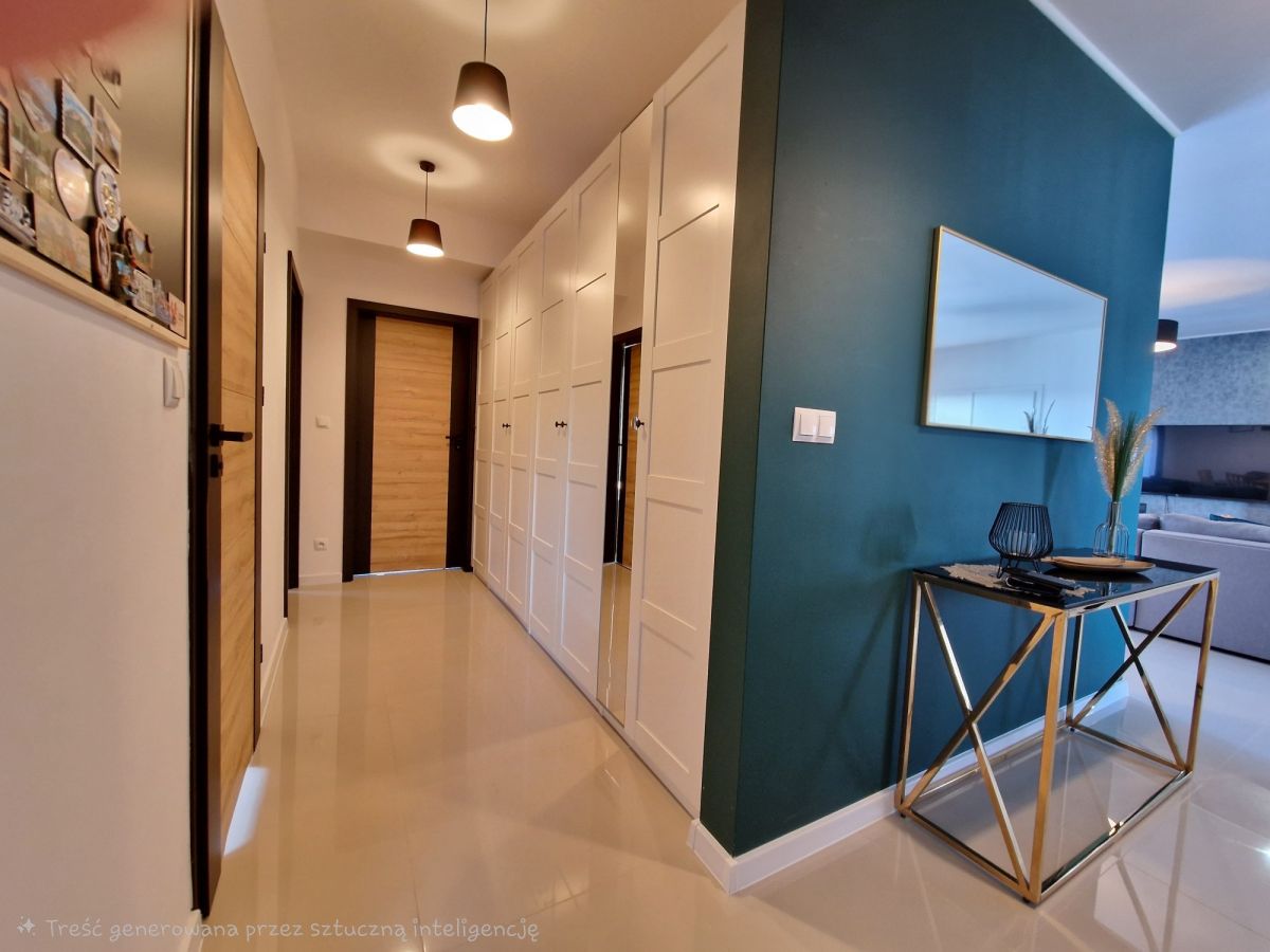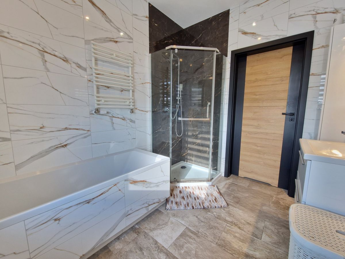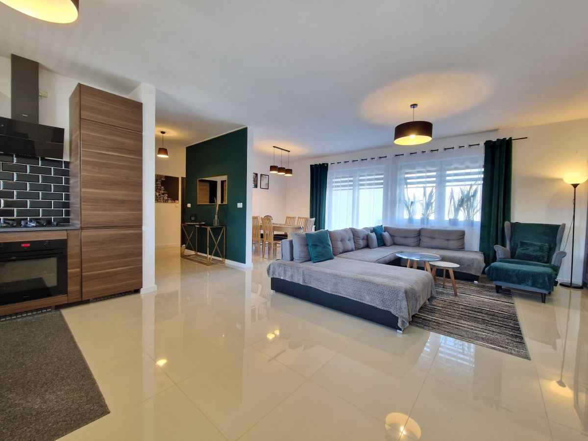 Przestronna, około 40m2 strefa dzienna - salon z aneksem kuchennym i wydzieloną częścią jadalną z wyjściem na taras (ok. 25m2), dodatkowo przy kuchni znajduje się podręczna spiżarnia, 3 sypialnie, łazienka z wanną i z kabiną prysznicową oraz oddzielne wc. Dodatkowa powierzchnia jaką jest poddasze stanowi doskonale miejsce do przechowywania. W bryle budynku garaż dla jednego samochodu, a przed domem wydzielona część do zaparkowania trzech kolejnych pojazdów.