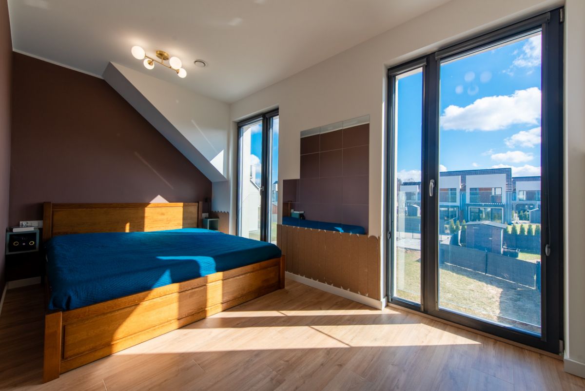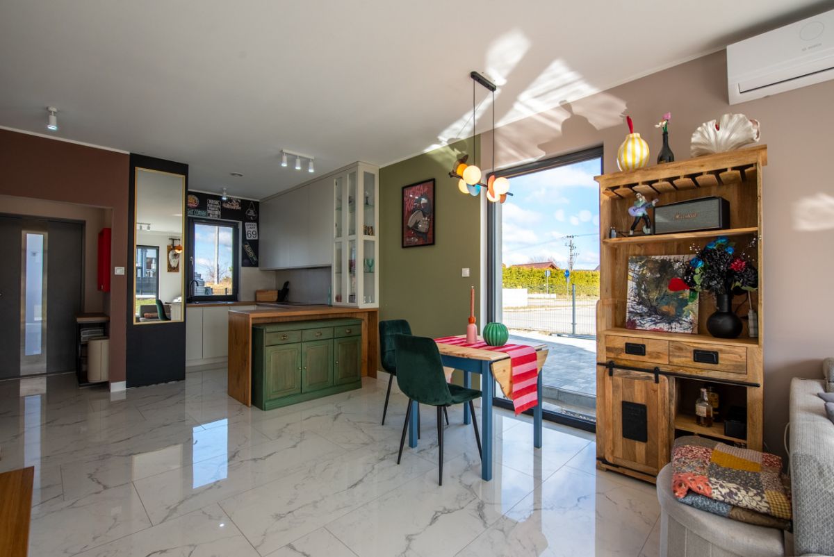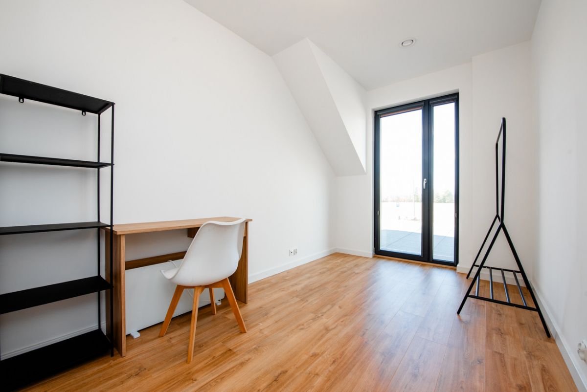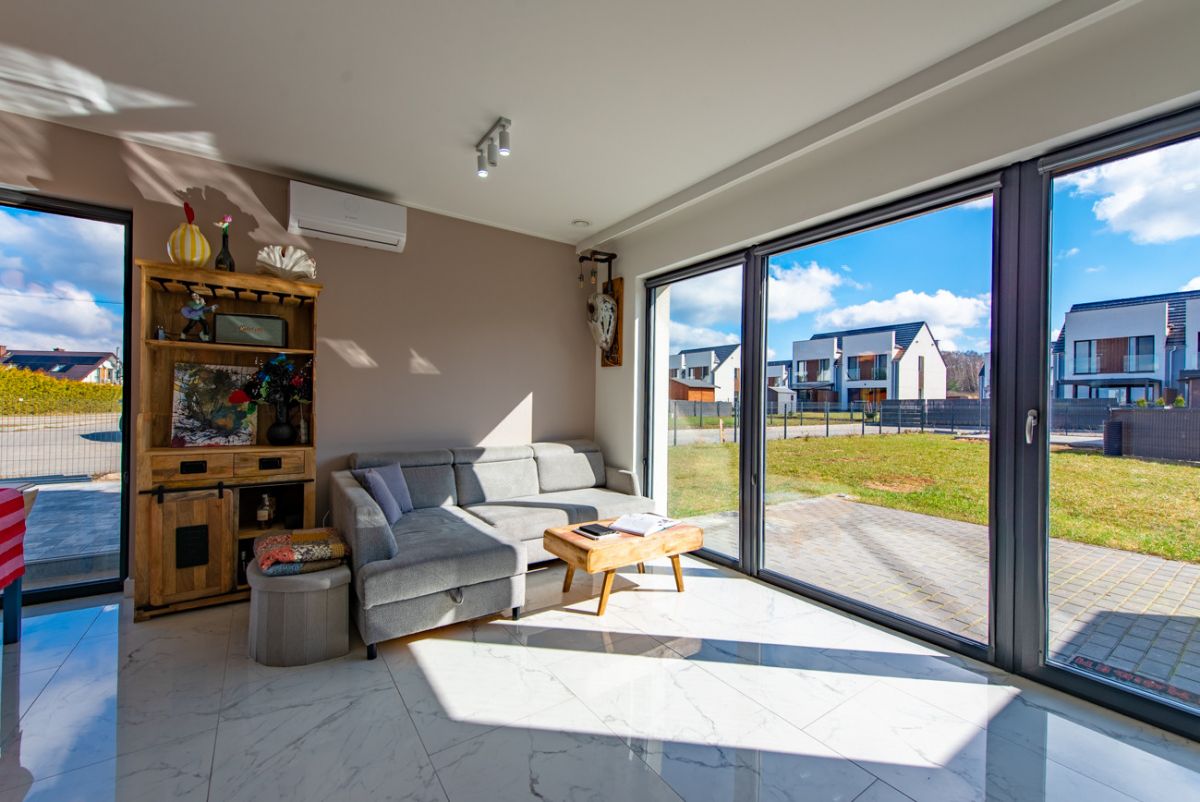 Dom został wykończony z wysokiej klasy materiałów i jest gotowy do zamieszkania. Parter tworzą wiatrołap, łazienka oraz jasny salon z jadalnią i dużymi oknami tarasowymi. Na piętrze znajdują się trzy sypialnie, hall oraz druga łazienka. Budynek wyposażono w podłogowe ogrzewanie zasilane pompą ciepła, rekuperację, klimatyzację, wideodomofon, drzwi antywłamaniowe i trzy‑szybowe okna. Układ pomieszczeń jest funkcjonalny, a wnętrza są bardzo dobrze doświetlone.