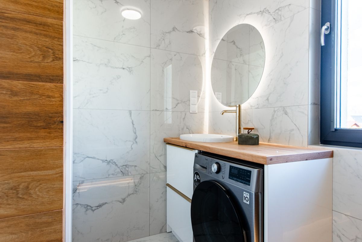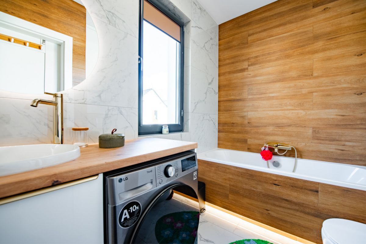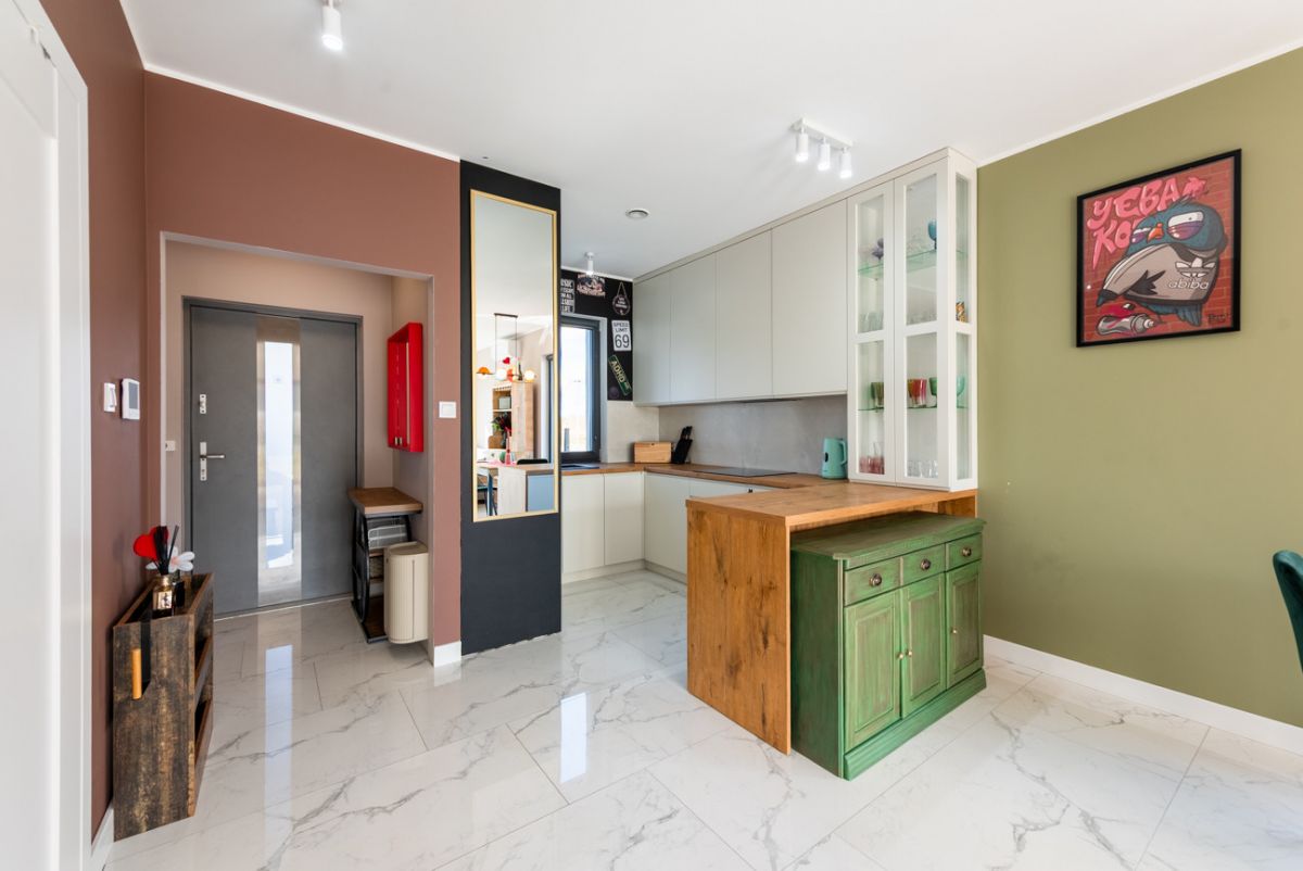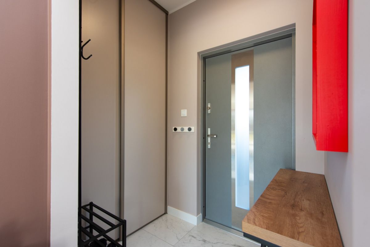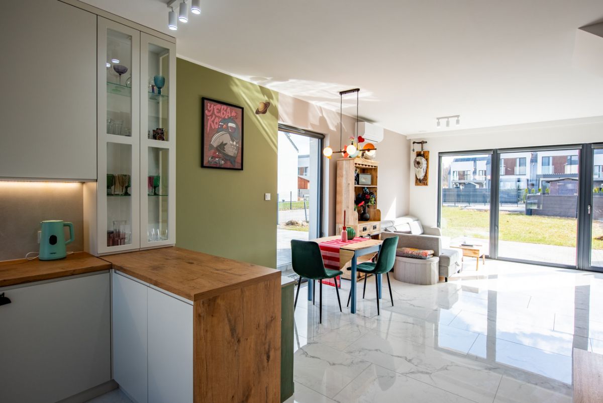 Dom został wykończony z wysokiej klasy materiałów i jest gotowy do zamieszkania. Parter tworzą wiatrołap, łazienka oraz jasny salon z jadalnią i dużymi oknami tarasowymi. Na piętrze znajdują się trzy sypialnie, hall oraz druga łazienka. Budynek wyposażono w podłogowe ogrzewanie zasilane pompą ciepła, rekuperację, klimatyzację, wideodomofon, drzwi antywłamaniowe i trzy‑szybowe okna. Układ pomieszczeń jest funkcjonalny, a wnętrza są bardzo dobrze doświetlone.