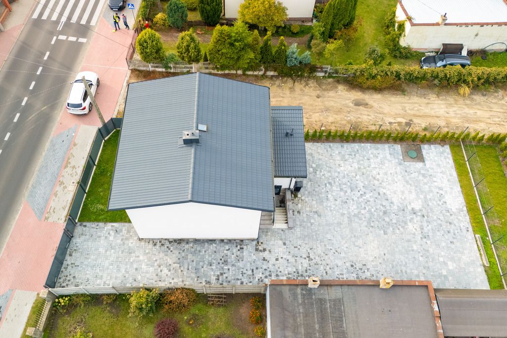 Podwórze: Z przodu zielona oaza na relaks, reszta posesji profesjonalnie wyłożona kostką brukową – czysto, sucho i elegancko.
