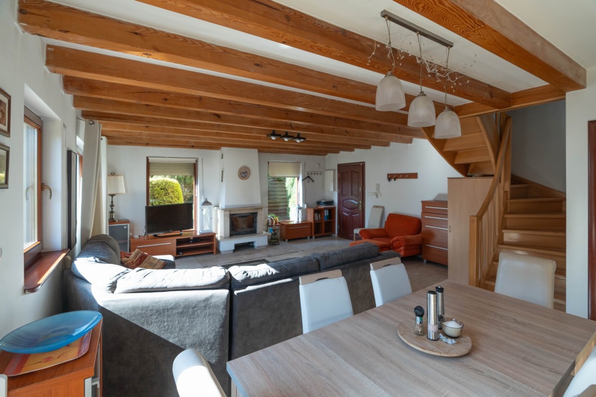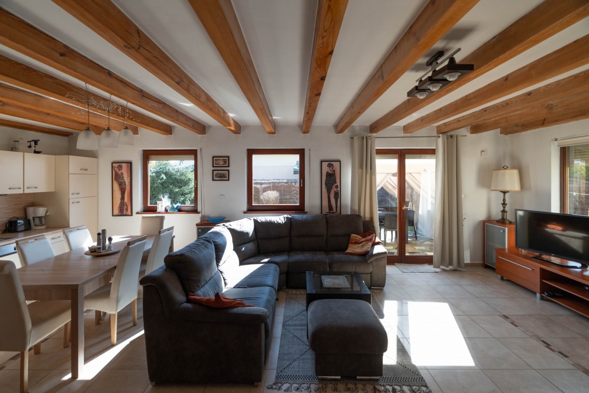- przestronny salon z kominkiem, który tworzy przytulną atmosferę także poza sezonem letnim