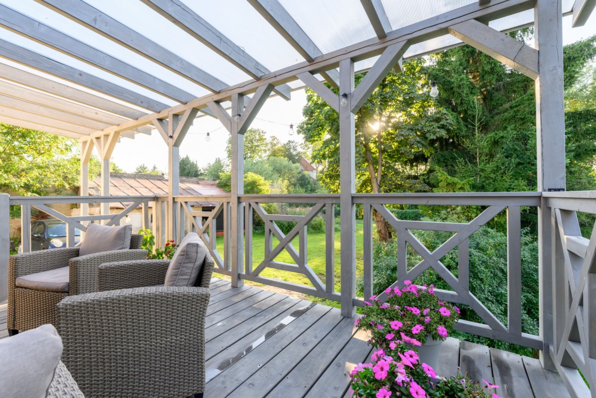 - Zadaszony taras o powierzchni 25 m² - idealny do odpoczynku i spotkań w otoczeniu zieleni.