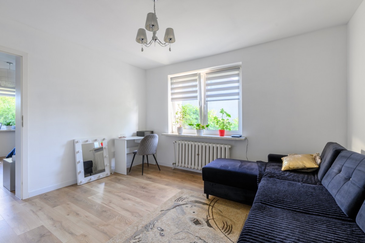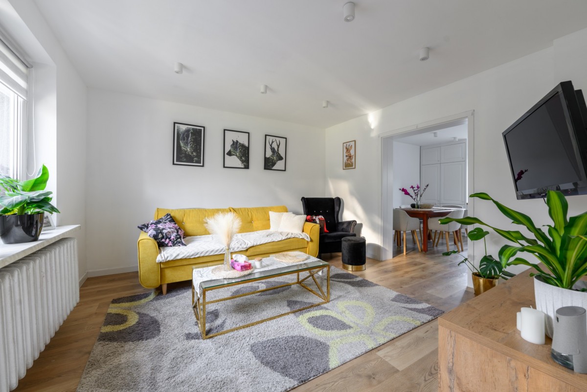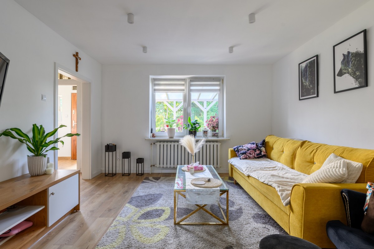 - Salon z widokiem na podwórko i ogród