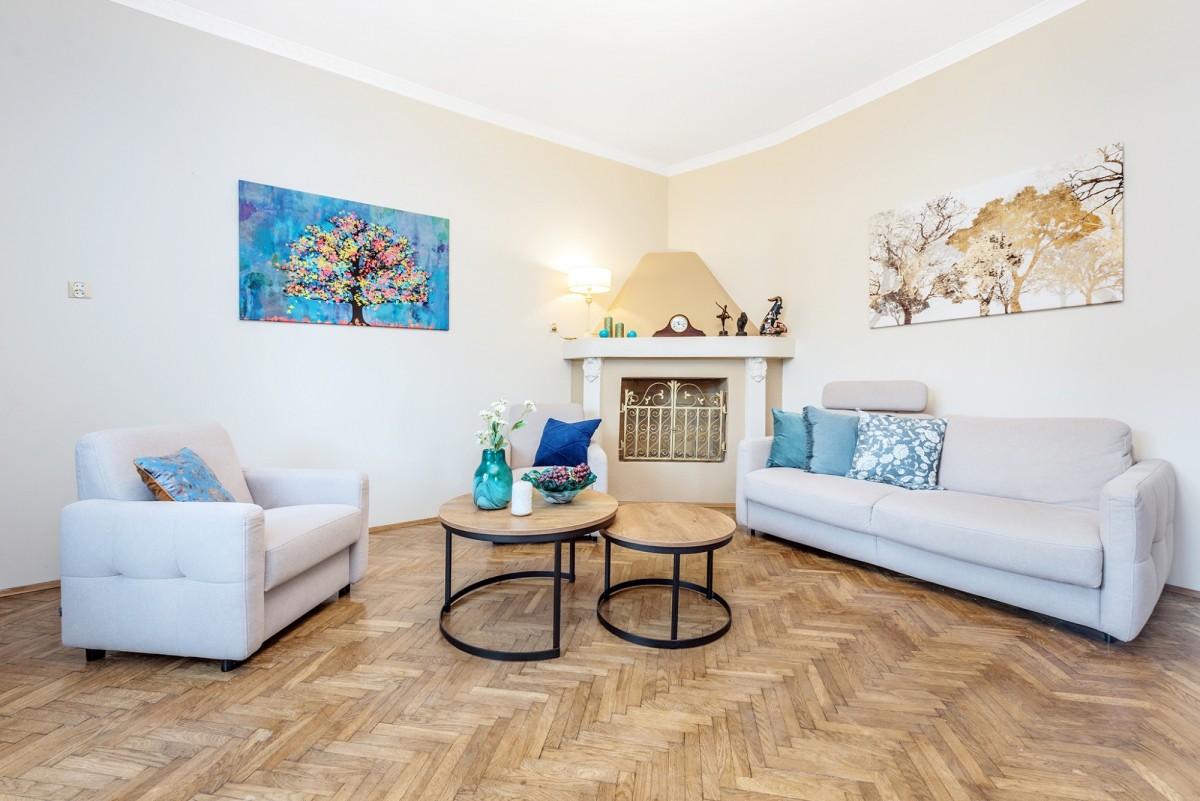 - salon z kominkiem