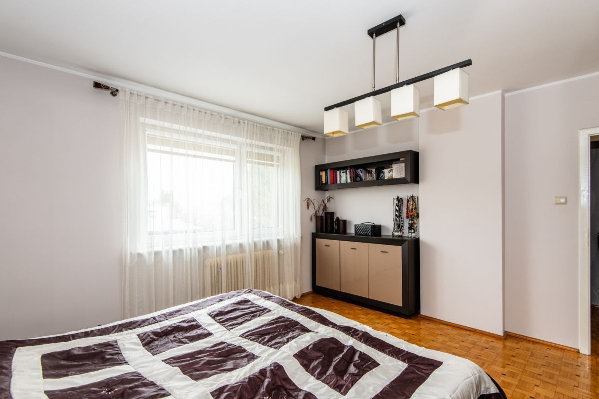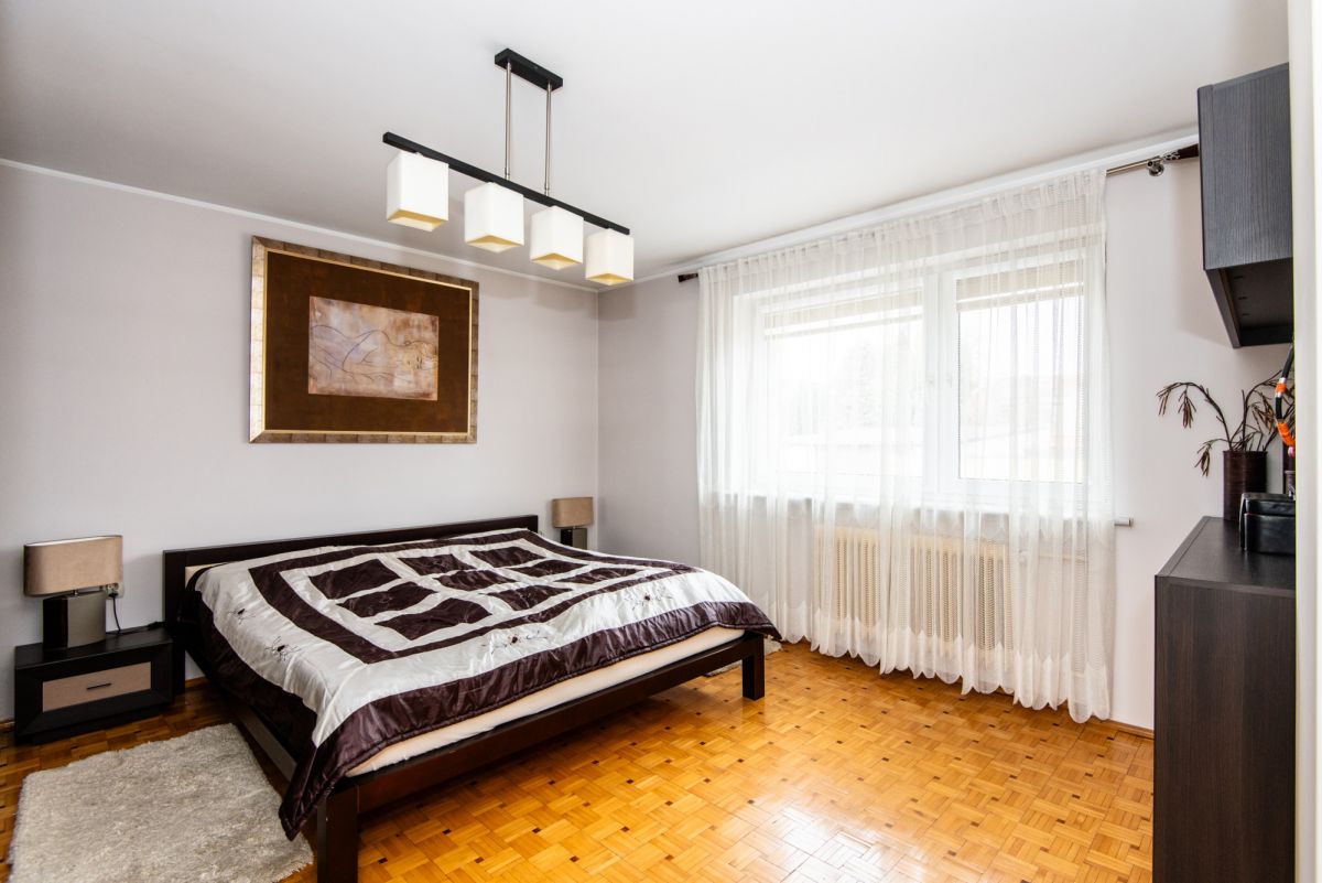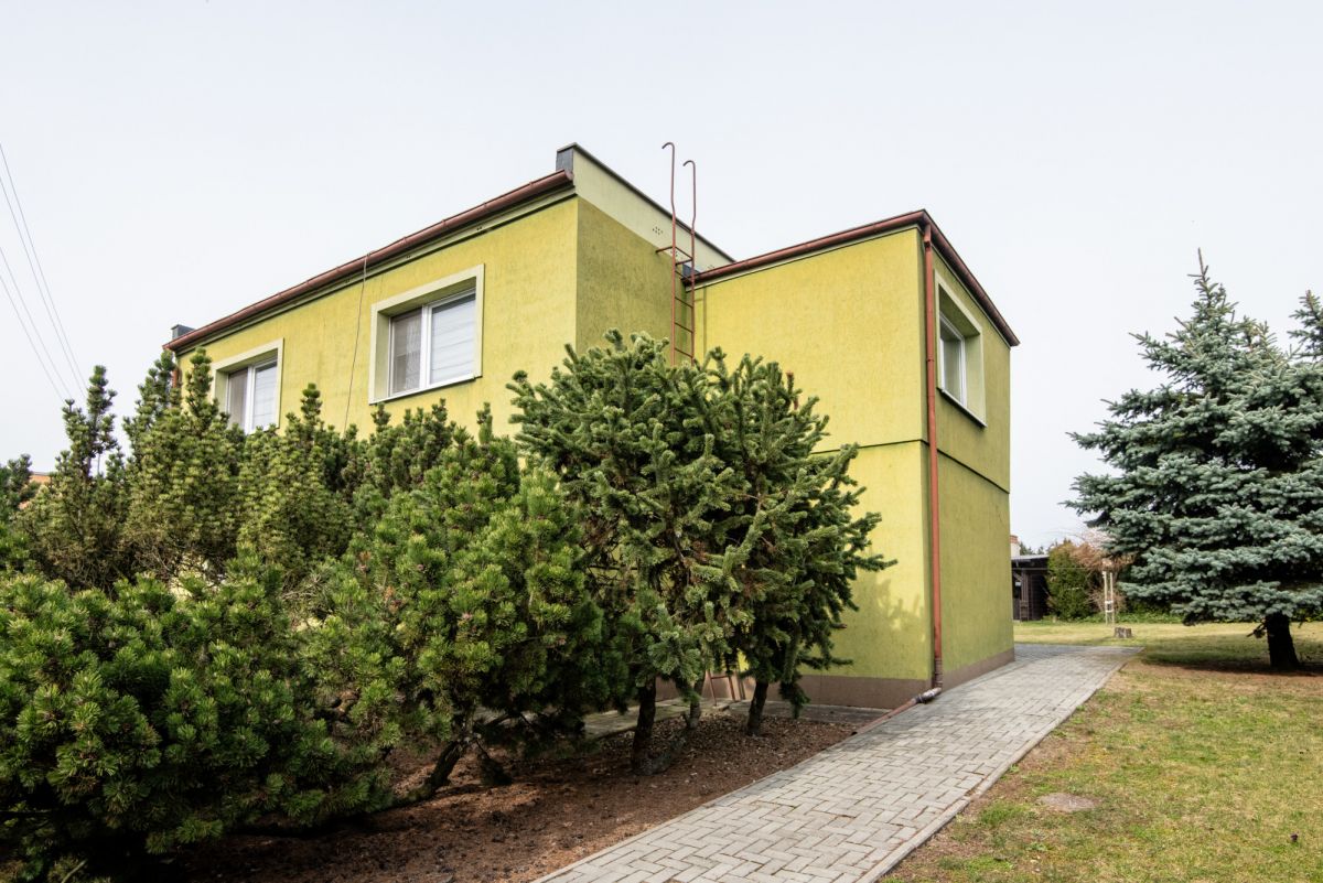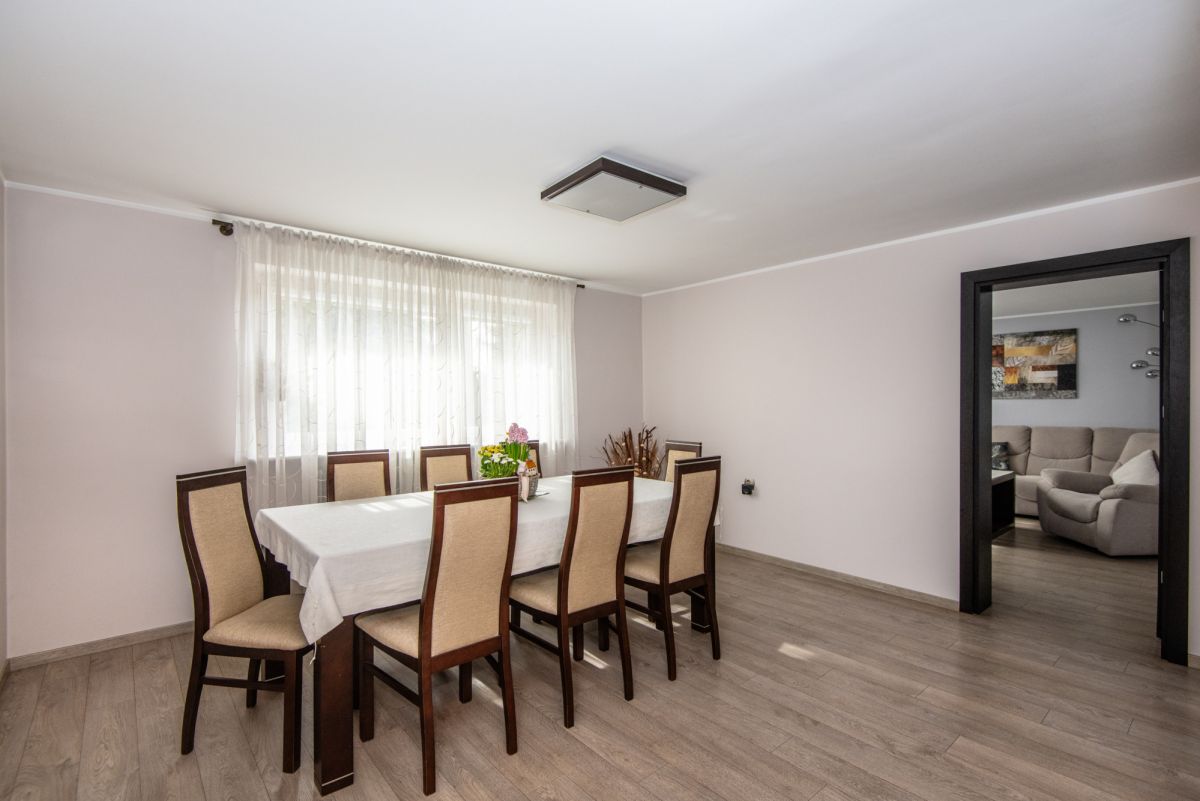 Piętro posiada możliwość niezależnego wejścia zarówno z zewnątrz, jak i poprzez schody wewnętrzne. Dzięki temu dom daje dużą swobodę w organizacji przestrzeni oraz sposobie użytkowania. Działka jest zagospodarowana i ogrodzona, a na jej terenie znajduje się garaż, wiata oraz pomieszczenie gospodarcze. Ogród daje możliwość stworzenia strefy relaksu lub dodatkowej przestrzeni użytkowej. Dach płaski, ocieplony i pokryty nową papą, umożliwia montaż instalacji fotowoltaicznej.
