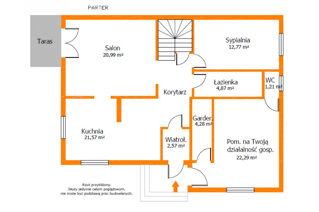 - pomieszczenie na działalność gospodarczą z własnym węzłem sanitarnym i osobnym wejściem z zewnątrz budynku.