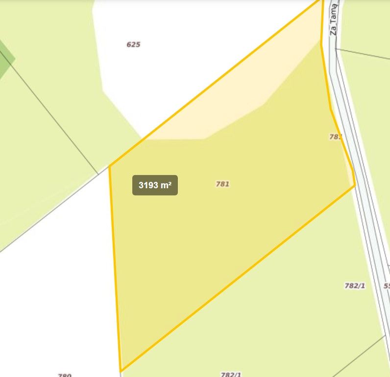 Działka w kształcie zbliżonym do prostokąta o wymiarach: 79 m x 54 m x 72 m x 49 m.