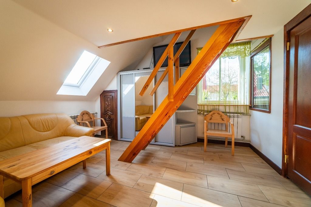 - Lokal mieszkalny (50,5 m² 20 m² użytkowego poddasza ) – na trzech poziomach. Składa się z kuchni, jadalni, 3 sypialni, łazienki, oddzielnej toalety. Do lokalu przynależy również piwnica (12,4 m²).