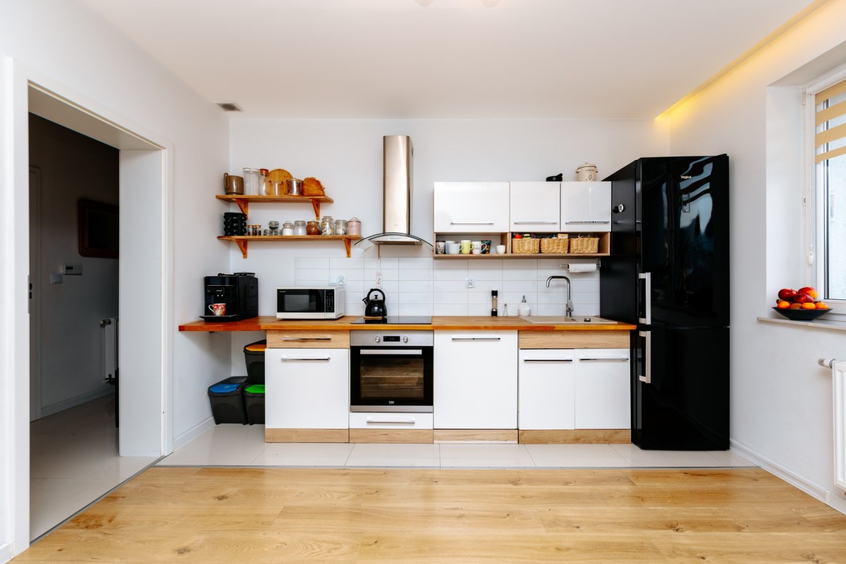 - kuchnia w zabudowie wyposażona w lodówkę, piekarnik, płytę indukcyjną oraz zmywarkę