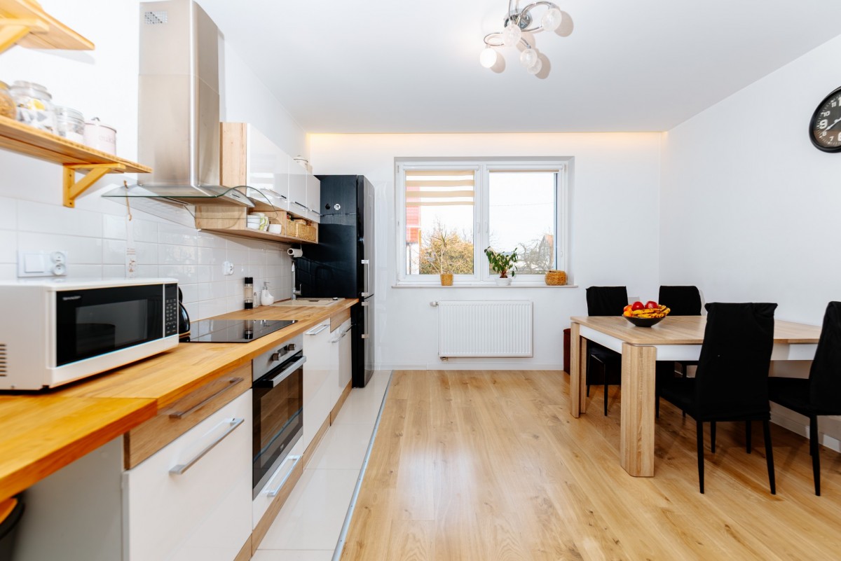 - na podłogach częściowo panele (w pokojach oraz kuchni) oraz płytki (w pozostałych pomieszczeniach)