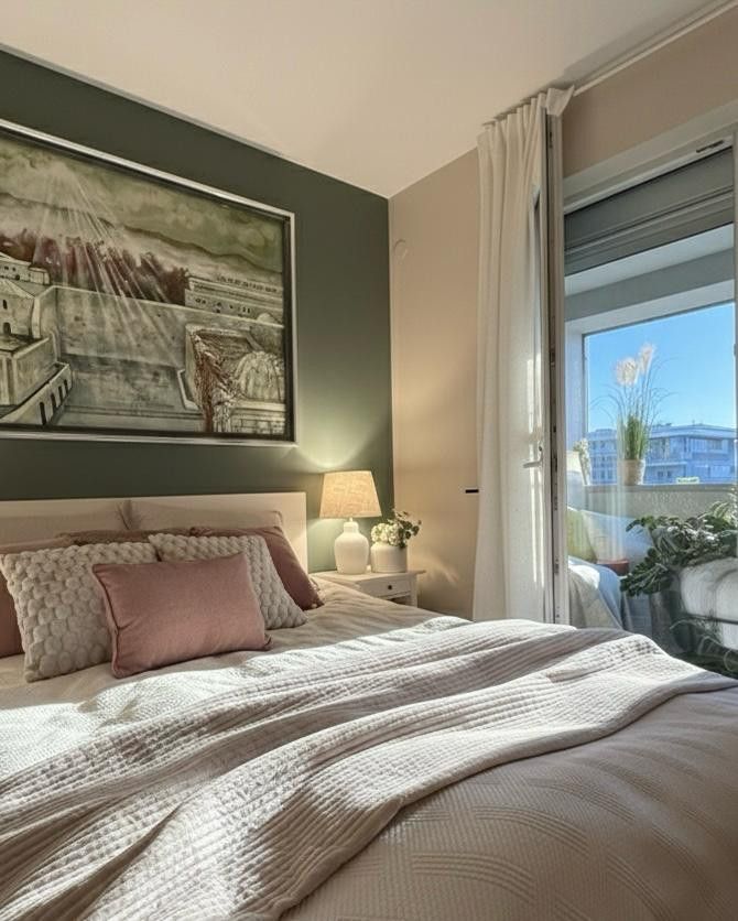 Rolety zewnętrzne w salonie i sypialni. Roleta rzymska, rolety zaciemniające i wentylator sufitowy w pokoju nr 2.