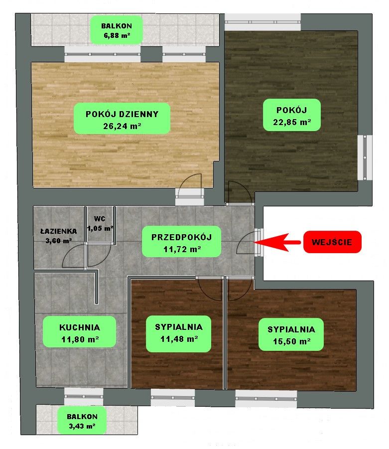 Szczegółowy rozkład pomieszczeń: Mieszkanie charakteryzuje się niezwykle funkcjonalnym układem: • Pokój 1: 26,24 m² • Pokój 2: 22,85 m² • Pokój 3: 15,50 m² • Pokój 4: 11,48 m² • Jasna, osobna kuchnia: 11,80 m² • Łazienka oraz osobna toaleta: 3,60 m², 1,05 m² • Dwa balkony: 6,88 m² oraz 3,43 m²