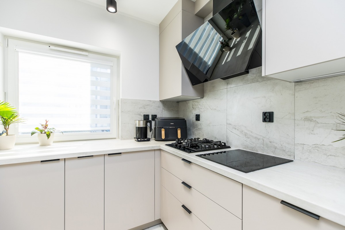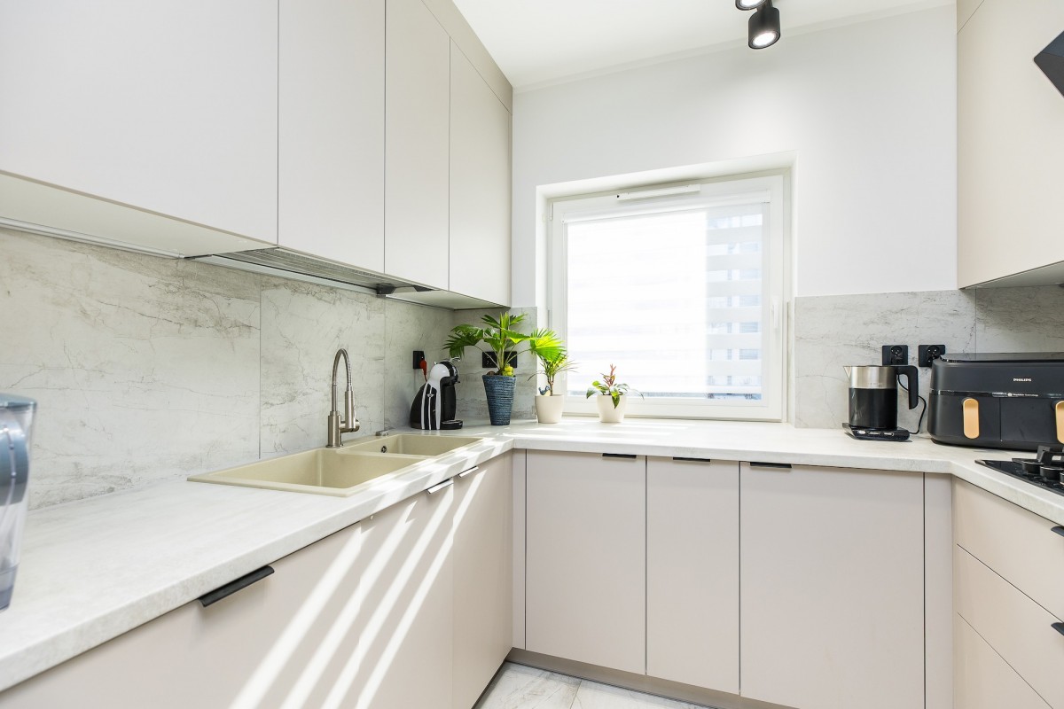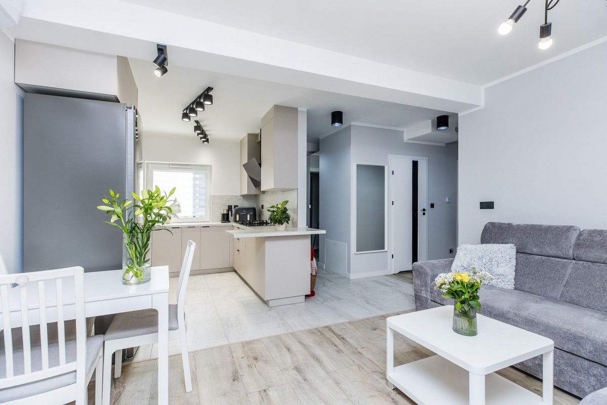 - jasnego salonu z aneksem kuchennym,