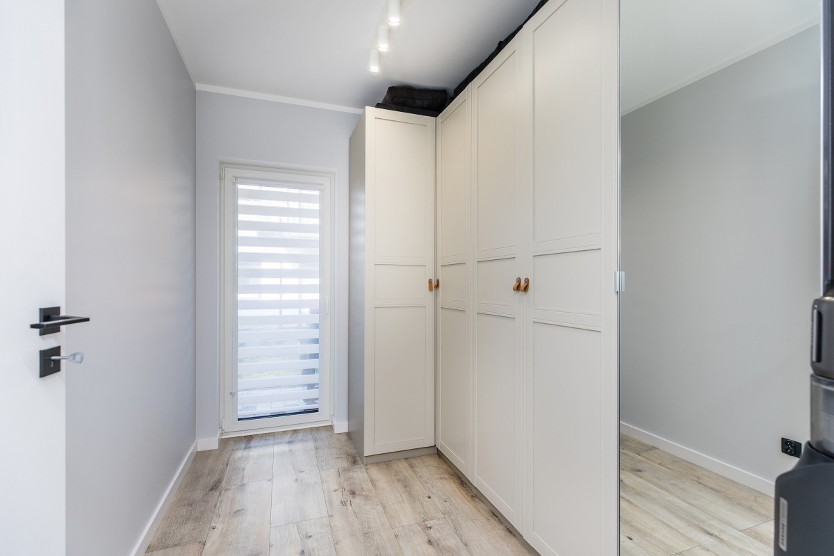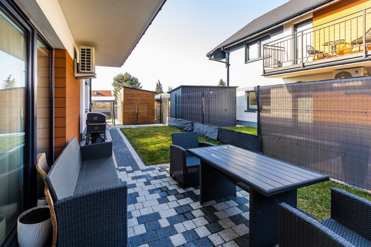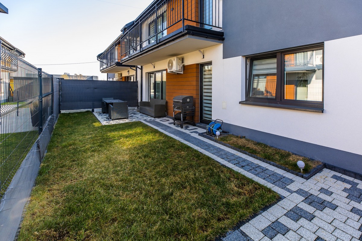Do mieszkania przynależy ogródek o powierzchni 50 m2 oraz 3 miejsca parkingowe. Ta prywatna strefa została starannie zagospodarowana tarasem z kostki brukowej oraz trawą z rolki, a dostęp do niej zapewniają dwa niezależne wyjścia. Całe osiedle charakteryzuje się estetycznym wykończeniem z kostki brukowej. Komfort mieszkańców podnosi zainstalowane w całym lokalu ogrzewanie podłogowe zasilane dwufunkcyjnym kotłem gazowym oraz system klimatyzacji. Wnętrza wyposażono w energooszczędne okna 3-szybowe z roletami dzień-noc, a o jakość wody dba nowoczesny zmiękczacz z filtrami. W lokalu znajduje się również instalacja siłowa oraz szybki światłowód.