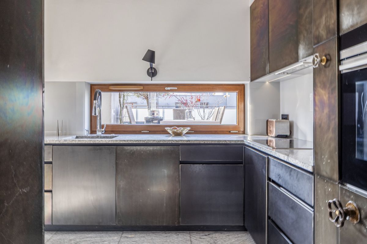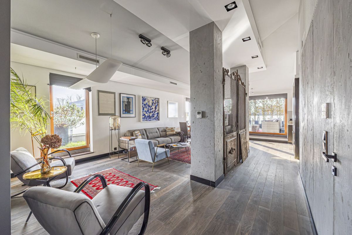 - Przestronny salon z jadalnią - z dużymi przeszkleniami i wyjściem na imponujący taras o powierzchni 100 m²