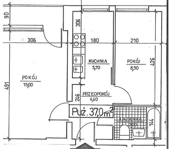 Powierzchnia mieszkania wynosi 37 m² i obejmuje: