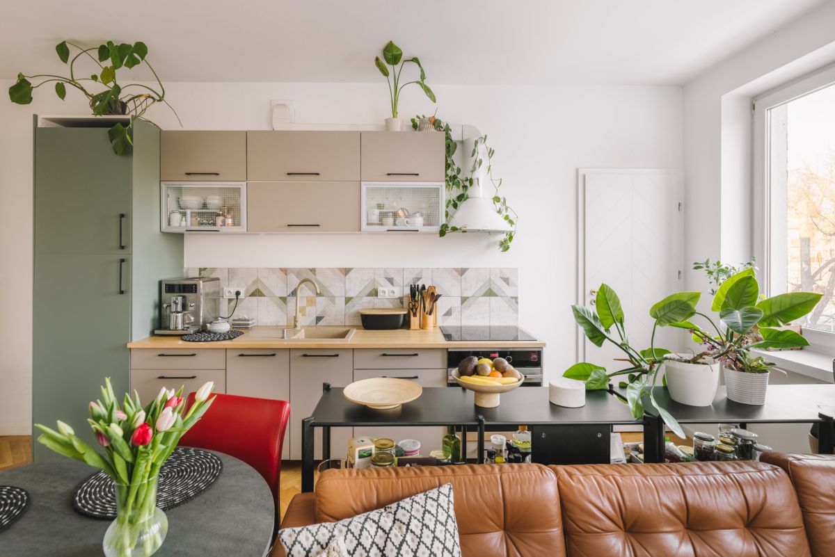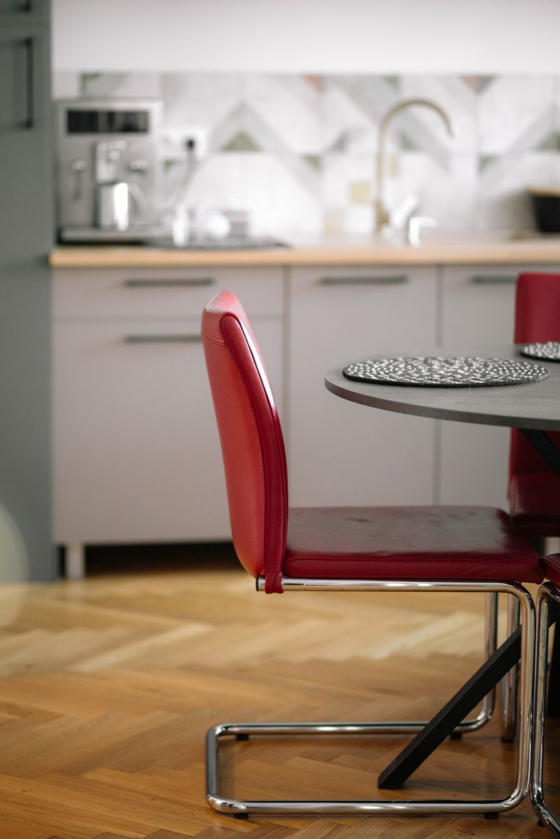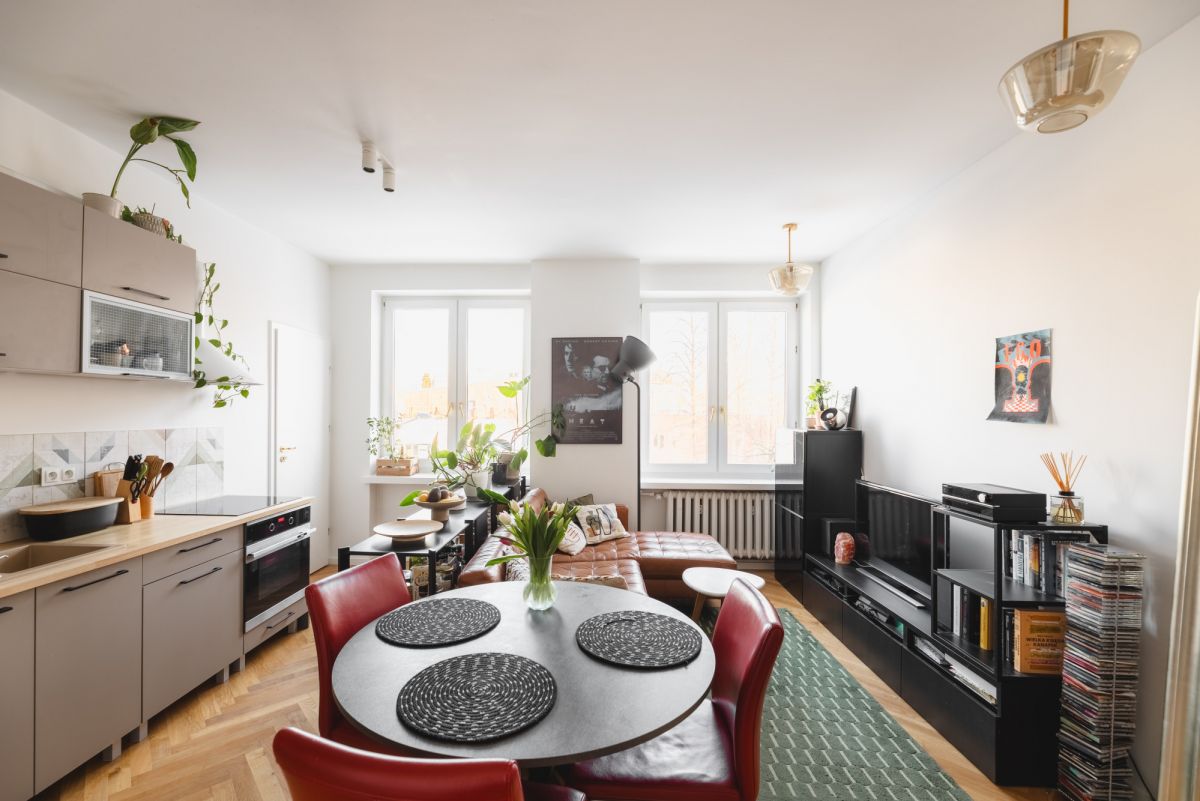 - Salon z aneksem kuchennym - jasna, ustawna przestrzeń dzienna. Na podłodze piękny, drewniany parkiet, który nadaje wnętrzu ciepła i charakteru. Aneks kuchenny w nowoczesnej zabudowie, wyposażony w niezbędny sprzęt AGD.