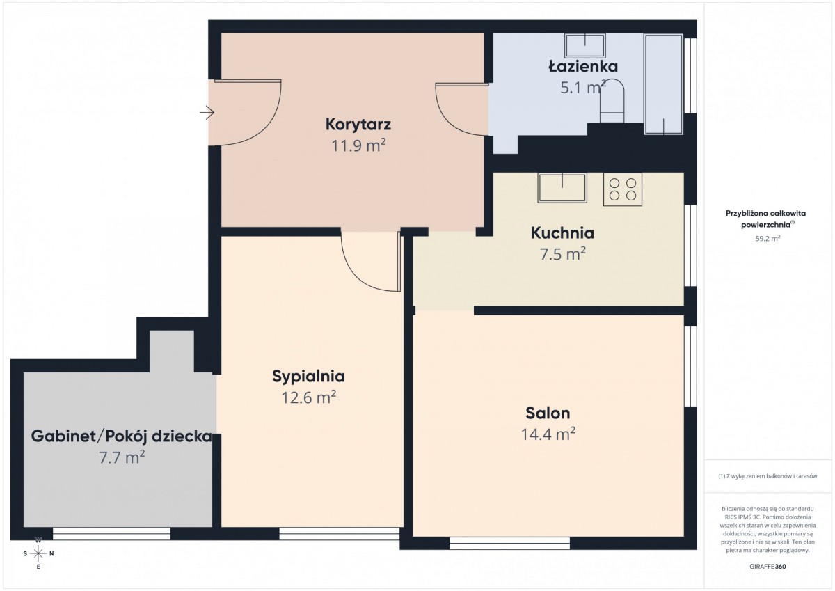 - Pokoju (idealny na biuro, pokój dziecka lub garderobę) - 7,7 m2