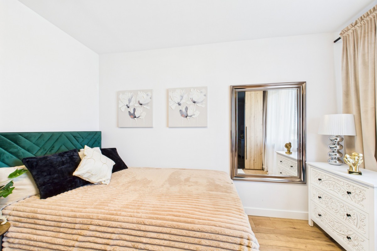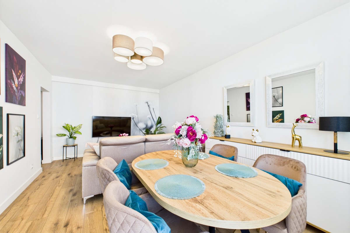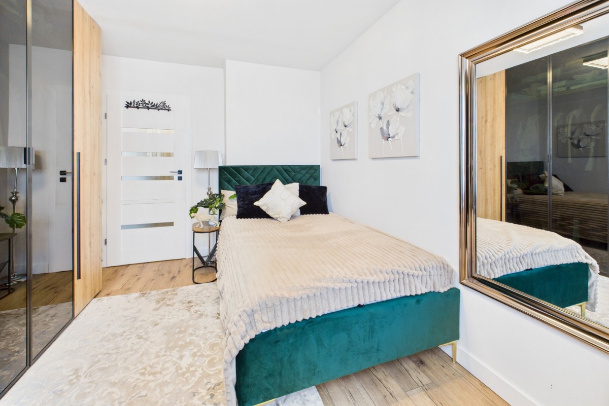 Wnętrze zachwyca nowoczesnym wykończeniem i funkcjonalnym rozkładem pomieszczeń. Do dyspozycji przyszłych właścicieli jest przestronny salon, w którym z łatwością mieści się stół jadalniany dla gości oraz komfortowy kącik wypoczynkowy z telewizorem. Osobna, widna kuchnia to idealne miejsce do gotowania, a ustawna sypialnia oferuje dużą, praktyczną szafę-garderobę, która pomieści wszystkie rzeczy osobiste. W przedpokoju przewidziano również miejsce na pojemną szafę w zabudowie. Łazienka z WC została utrzymana w stonowanej kolorystyce, a nowe drzwi wejściowe, wymienione w tym roku, zapewniają bezpieczeństwo i estetykę.