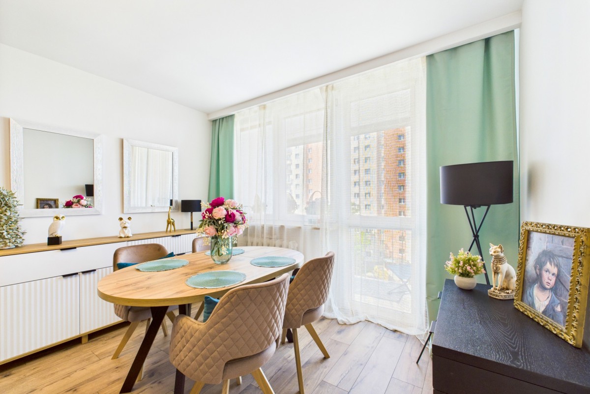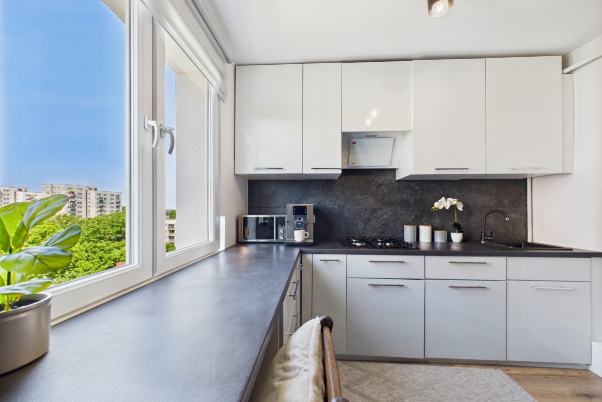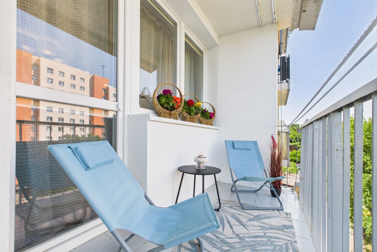 Lokal znajduje się na 5. piętrze wysokiego bloku z windą, co gwarantuje świetny widok z okien i ciszę z dala od ulicznego zgiełku. Mieszkanie jest bardzo słoneczne, balkon wychodzi na południowo-zachodnią stronę, zapewniając naturalne światło przez większość dnia. Na balkonie na leżaczkach jest idealne miejsce na poranną kawę czy relaks po pracy.