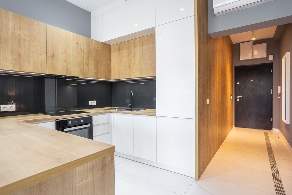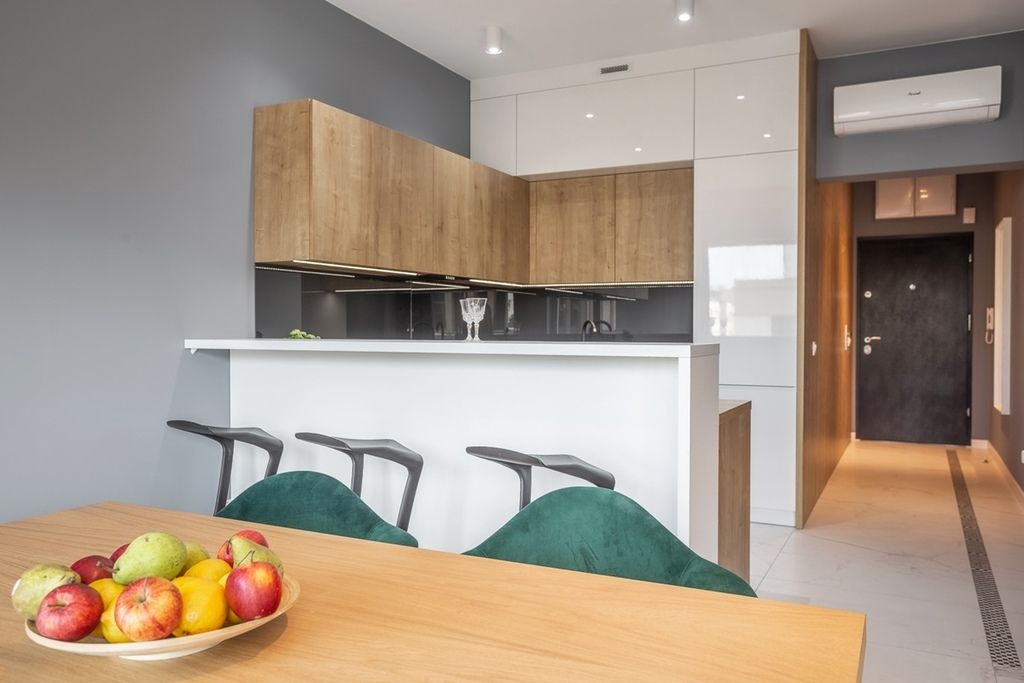 Apartament z nowoczesnym wykończeniem i wyposażeniem. Okna aluminiowe wychodzą na zachód, dzięki czemu mieszkanie jest jasne i słoneczne. Wysokość pomieszczeń wynosi 2,7 m, co dodatkowo podkreśla przestronność wnętrza.