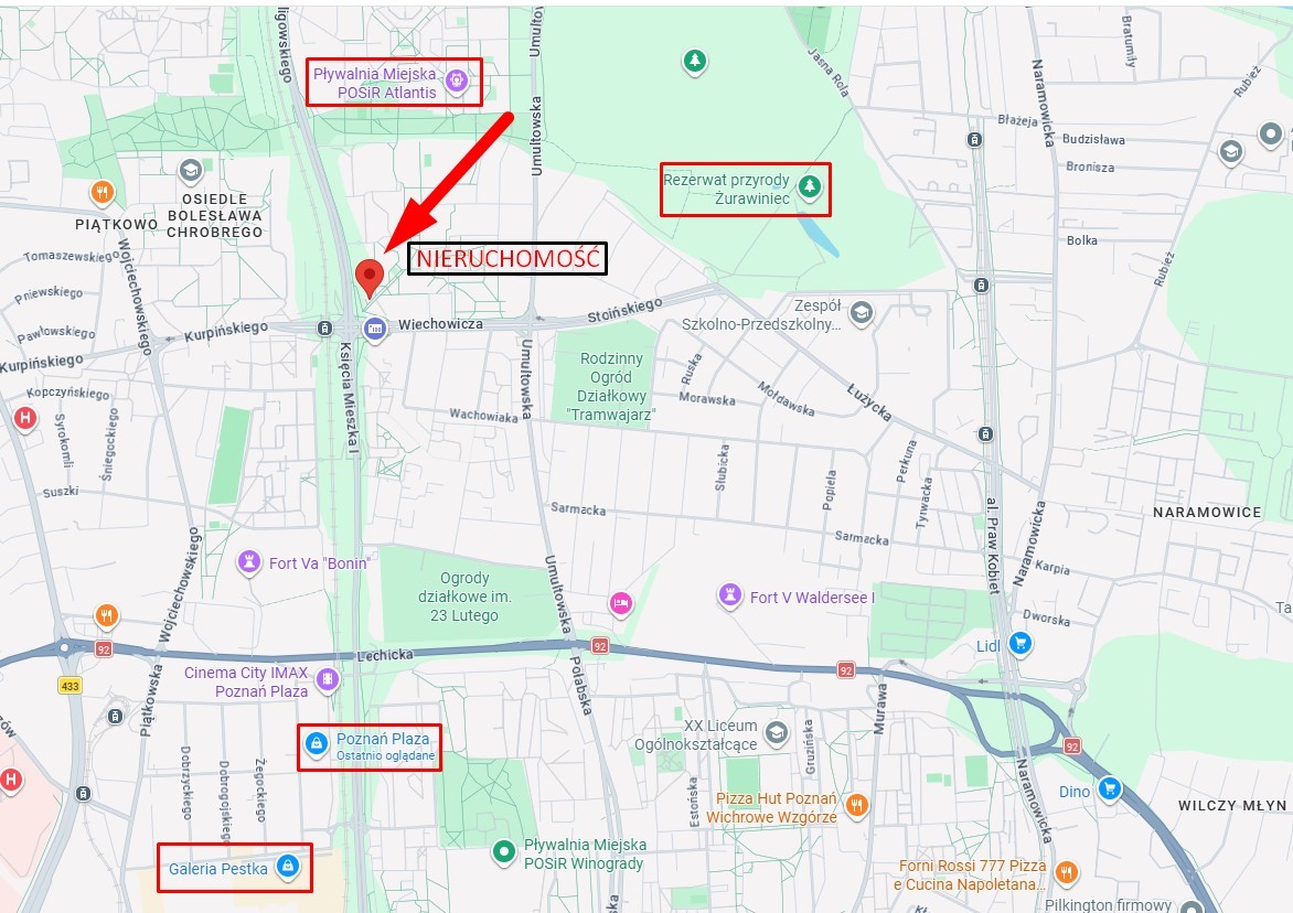 Nieruchomość znajduje się w doskonałym punkcie Poznania. Dzięki kilku liniom autobusowym oraz szybkiemu tramwajowi - PST (przystanek tramwajowy i autobusowy tuż obok bloku) mieszkańcy mogą wygodnie przemieszczać się do innych części miasta. W odległości 1,4 km (jeden przystanek tramwajem lub 15 minut pieszo) znajduje się centrum handlowe Poznań Plaza. Lokalizacja zapewnia ponadto szybki dojazd do kampusu Uniwersytetu im. Adama Mickiewicza w Morasku. W bezpośrednim otoczeniu znajdują się liczne sklepy, markety (m.in: Biedronka, Chata Polska, Intermarche), punkty usługowe, szkoły i przedszkola.