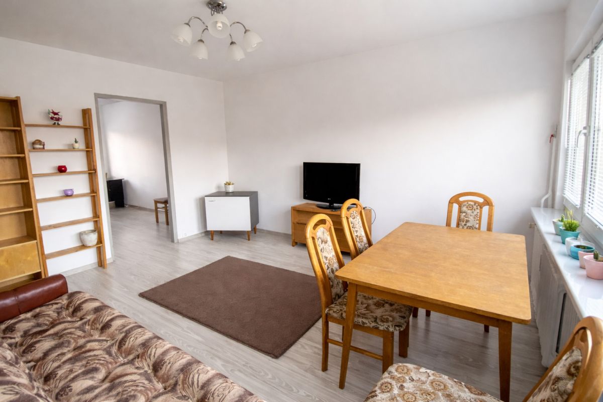 - przechodniego przestronnego salonu/pokoju z rozkładaną sofą, stołem oraz krzesłami,