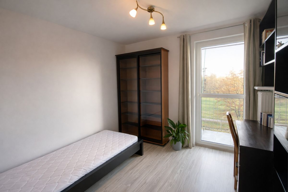 - sypialni z łóżkiem, biurkiem (przynależy mały balkon)