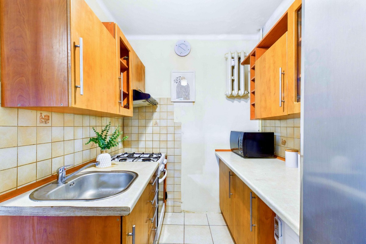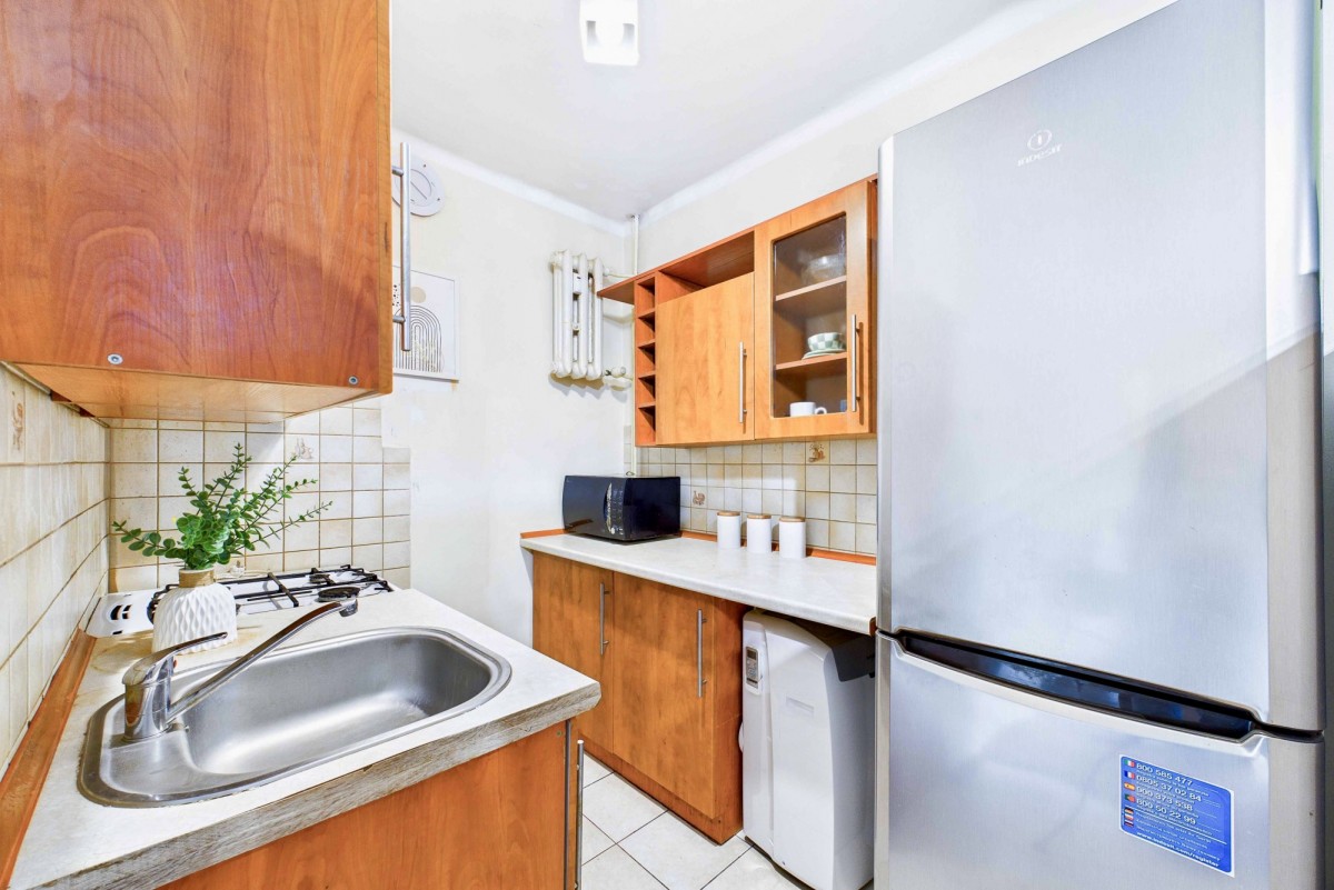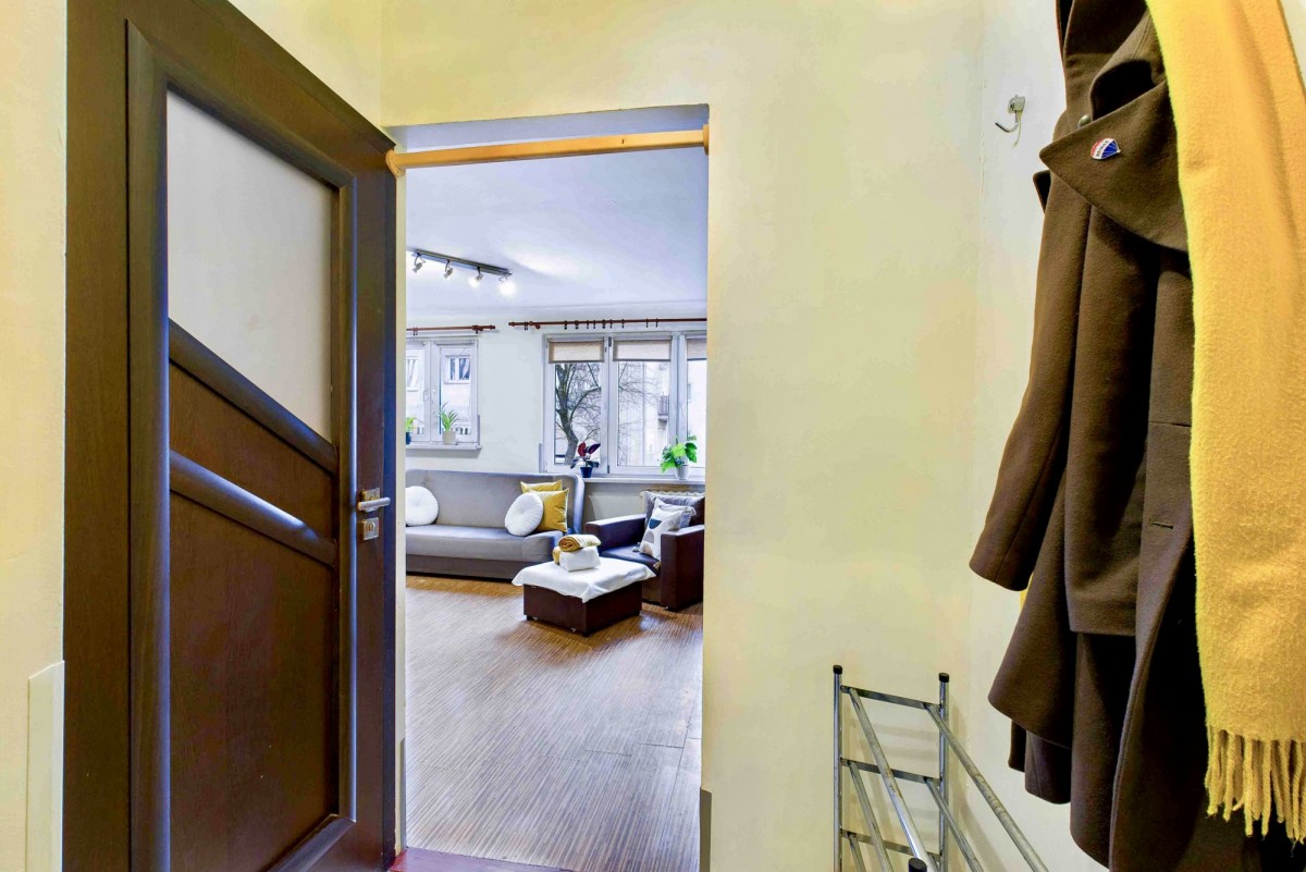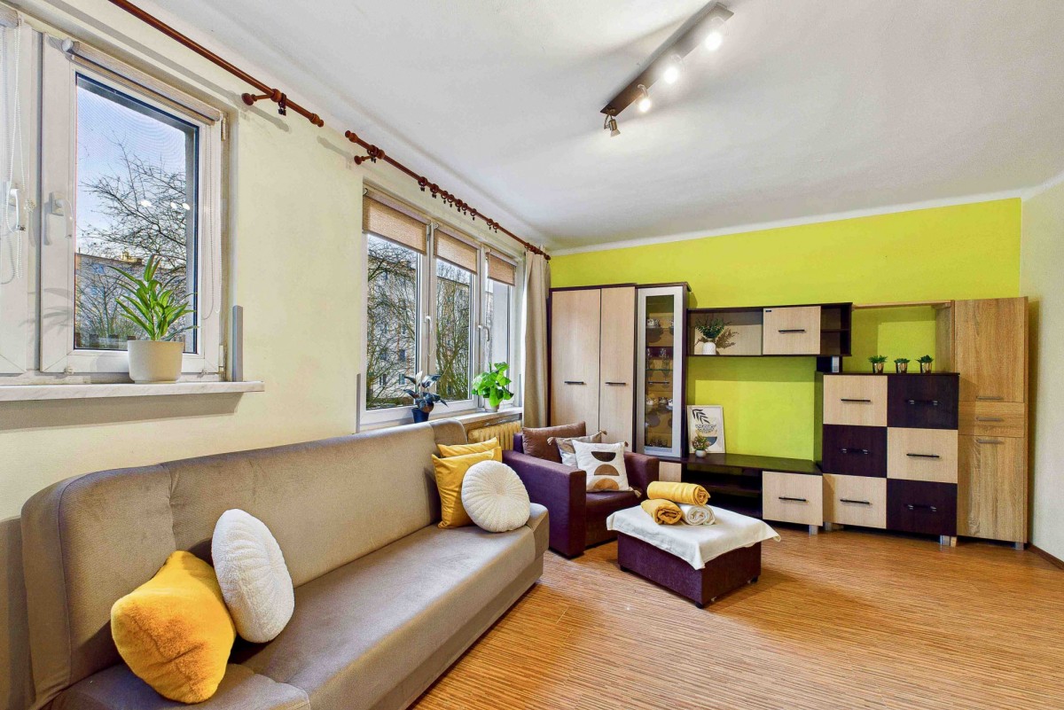 Mieszkanie znajduje się na 1. piętrze niskiego, 4-piętrowego bloku. Lokal jest w pełni umeblowany i wyposażony we wszystkie niezbędne sprzęty oraz meble, w tym nową, wygodną kanapę rozkładaną do spania. Składa się z: