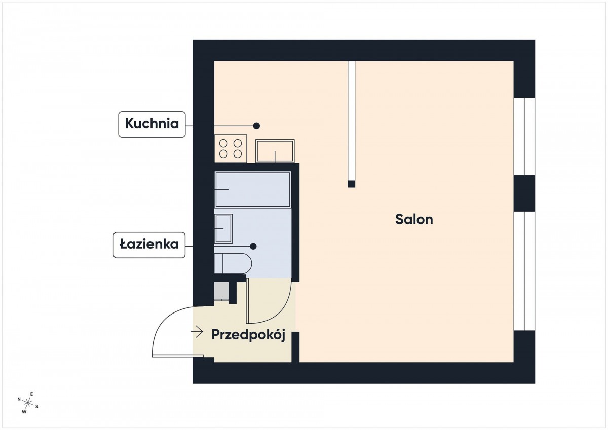 Ogromnym atutem mieszkania są duże okna na niemal całą ścianę, skierowane na południową stronę, dzięki czemu wnętrze jest bardzo jasne i słoneczne przez cały dzień. Mieszkanie nie posiada balkonu, jednak ilość naturalnego światła w pełni to rekompensuje.